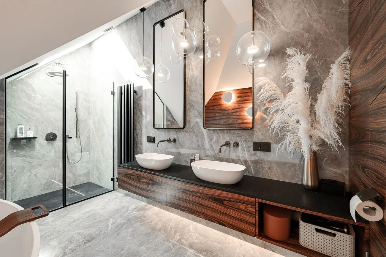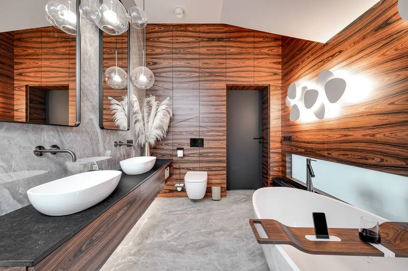 Motywem dominującym jest fornir z orzecha amerykańskiego, z którego wykonana jest zabudowa meblowa z szafkami o skośnych frontach oraz półkami pod umywalki. W zabudowie ukryty został stelaż podtynkowy Geberit. Właściciel domu jest entuzjastą nowinek technologicznych i nowoczesnych rozwiązań, dlatego przyciskiem, który został zastosowany w tej łazience jest szklany, elektroniczny przycisk spłukujący Geberit Sigma80 o czarnym kolorze. Przycisk jest funkcjonalny i zarazem bardzo elegancki, idealnie pasuje do charakteru łazienki.