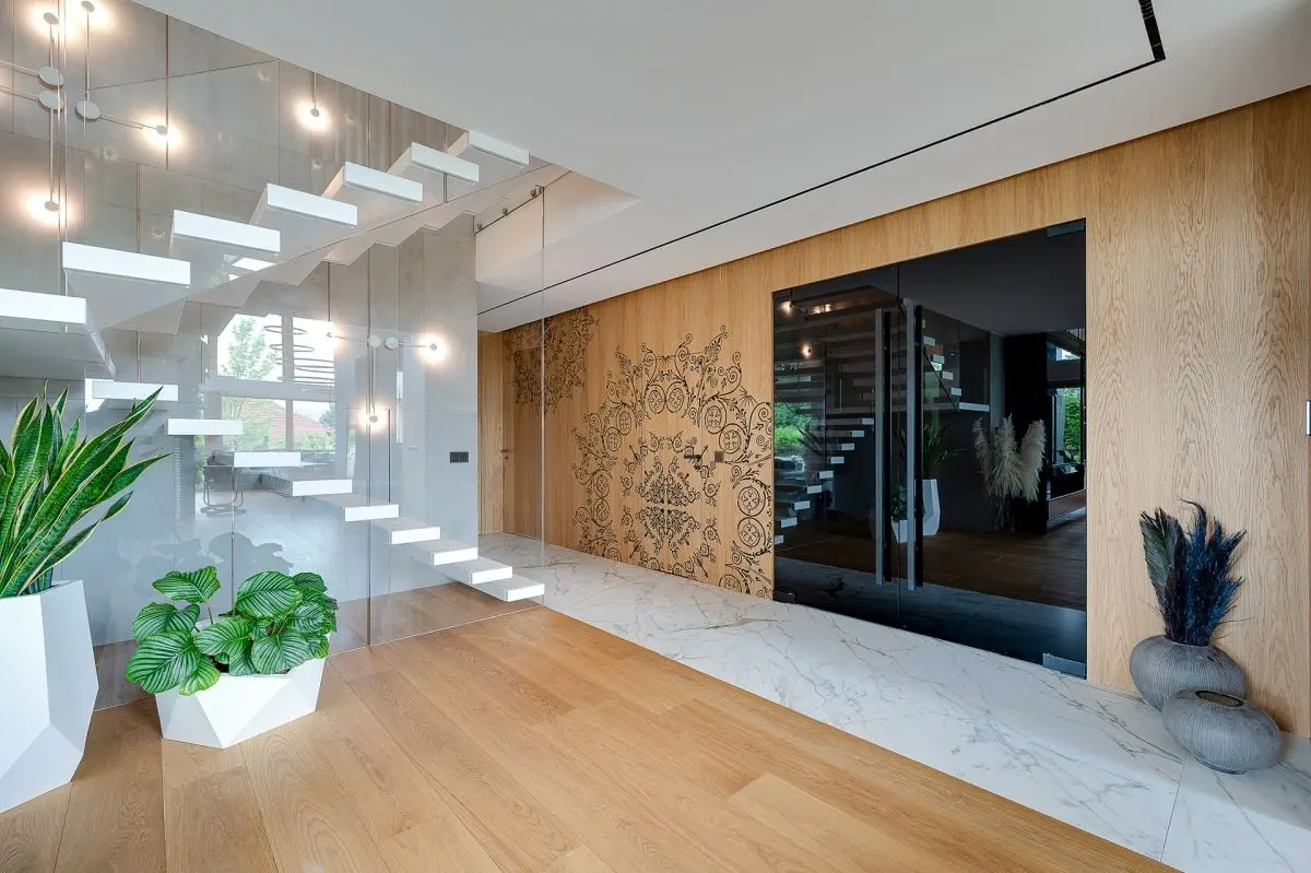 W otwartej strefie dziennej, ale i innych pomieszczenia, pojawiają się naturalne materiały – drewno i kamień, a charakterystyczne dla tego regionu motywy folklorystyczne. Wśród tych ostatnich na szczególna uwagę zasługują wypalony specjalną metodą na fornirowanej ścianie mandale z góralskimi ornamentami.