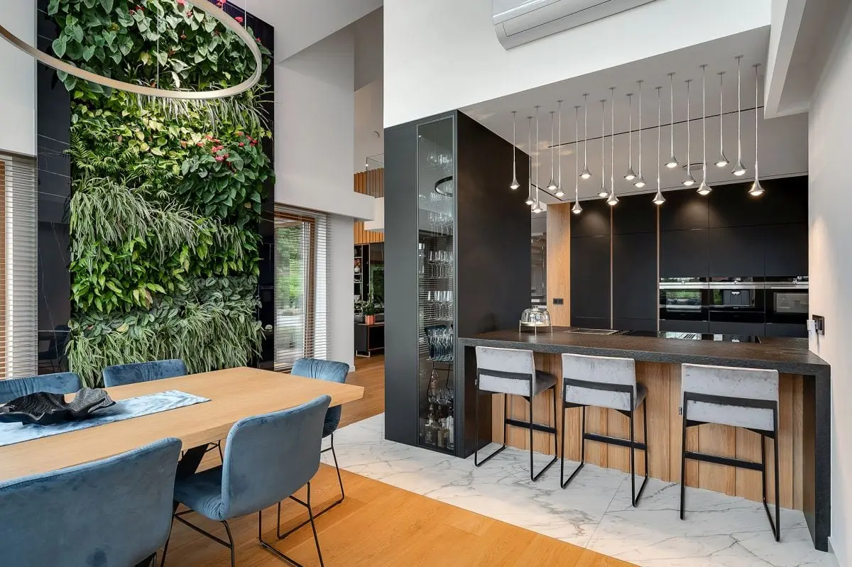 O tym, jak ważne jest to ostatnie, przekonuje otwarta na dwie kondygnacje przestrzeń jadalni. Organizuje ją duży, drewniany stół, przy którym zasiąść może aż 10 osób. Co więcej, we wnętrzu swoje miejsce odnajdą nie tylko wszyscy domownicy i ich goście, ale też zachwycające górskie pejzaże, obecne we wnętrzu dzięki dużym przeszkleniom. Rolę natury wnętrzu podkreśla, także dekoracyjna ściana z żywej zieleni, która wyznacza granicę między kuchnią a jadalnią. Żywe rośliny to jedna z najpiękniejszych ozdób tego wnętrza, podkreślając jego silny i zarazem pełen harmonii związek z otoczeniem.