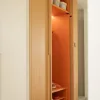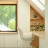 Pokoje dziewczynek utrzymano w jasnej tonacji, z wykorzystaniem sklejki i trwałych materiałów drewnopodobnych, które łączą estetykę z odpornością na codzienne użytkowanie.