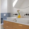 Łazienka ogólnodostępna wypełniona jest naturalnym światłem. W aranżacji połączono małoformatowe płytki w bieli i niebieskościach z graficznym biało-czarnym wzorem. Całość ociepla dębowy fornir w postaci szafki pod umywalkę, który wprowadza element naturalności i równowagi.