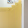 Elementem wyróżniającym jest zabudowa meblowa w pogodnym, żółtym kolorze, kryjąca kolekcję butów. Żółta żywica pojawia się także na klatce schodowej, tworząc spójny, wyrazisty akcent. Zaskakującym detalem są kolorowe wnętrza szaf – po otwarciu witają domowników zupełnie inną barwą płyty meblowej.