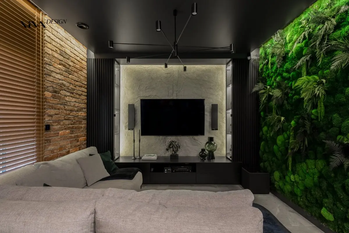 Aby uzyskać nietuzinkowy efekt zamiast gładkich ścian i sufitów zastosowaliśmy tynk strukturalny (mielony marmur barwiony na kolor beżowo szary). Imitacja boazerii na ścianie korytarza to ukłon w kierunku tradycyjnej boazerii jaka występuje w Skandynawii. Jest ona jednak podrasowana ciemno zielonym kolorem – wyjaśnia Barbara Steciak. – Ciemne kolory ziemi to wyznacznik tego projektu. Kolor zieleni jaki pojawia się w postaci ściany z roślin stabilizowanych podkręca tylko wrażenie przebywania w norweskich lasach. Ponadto ważną rolę odgrywa w tym projekcie podłoga. W salonie i kuchni postawiliśmy na elegancki kamień zaś w górnej części, gdzie mieści się sypialnia i garderoba zamontowano drewnianą podłogę w ciepłym odcieniu brązu, która współgra z czarnymi elementami pomieszczeń.