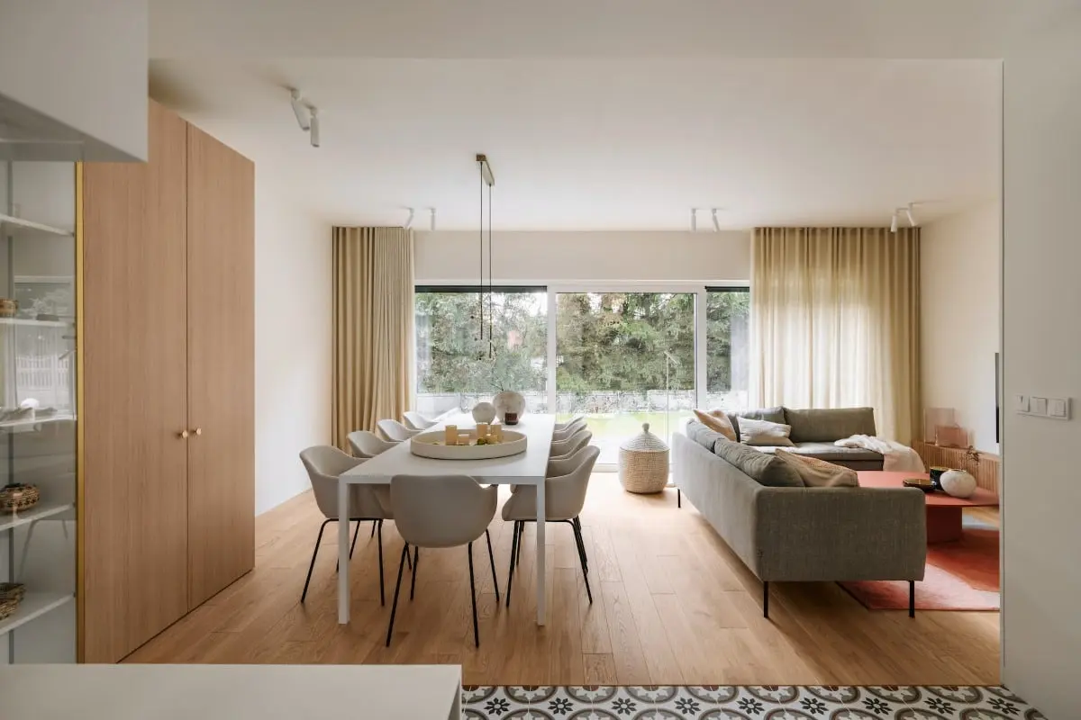 Ciepłą atmosferę buduje beż na ścianach oraz drewno na podłodze. Hiszpański akcent wprowadza stolik kawowy w kolorze ceglastego różu oraz sofy w odcieniu oliwkowym. Nienachalną elegancję zapewniają złote akcenty oraz designerskie oświetlenie. Proste zabudowy mebli stanowią ukłon w stronę nowoczesności.