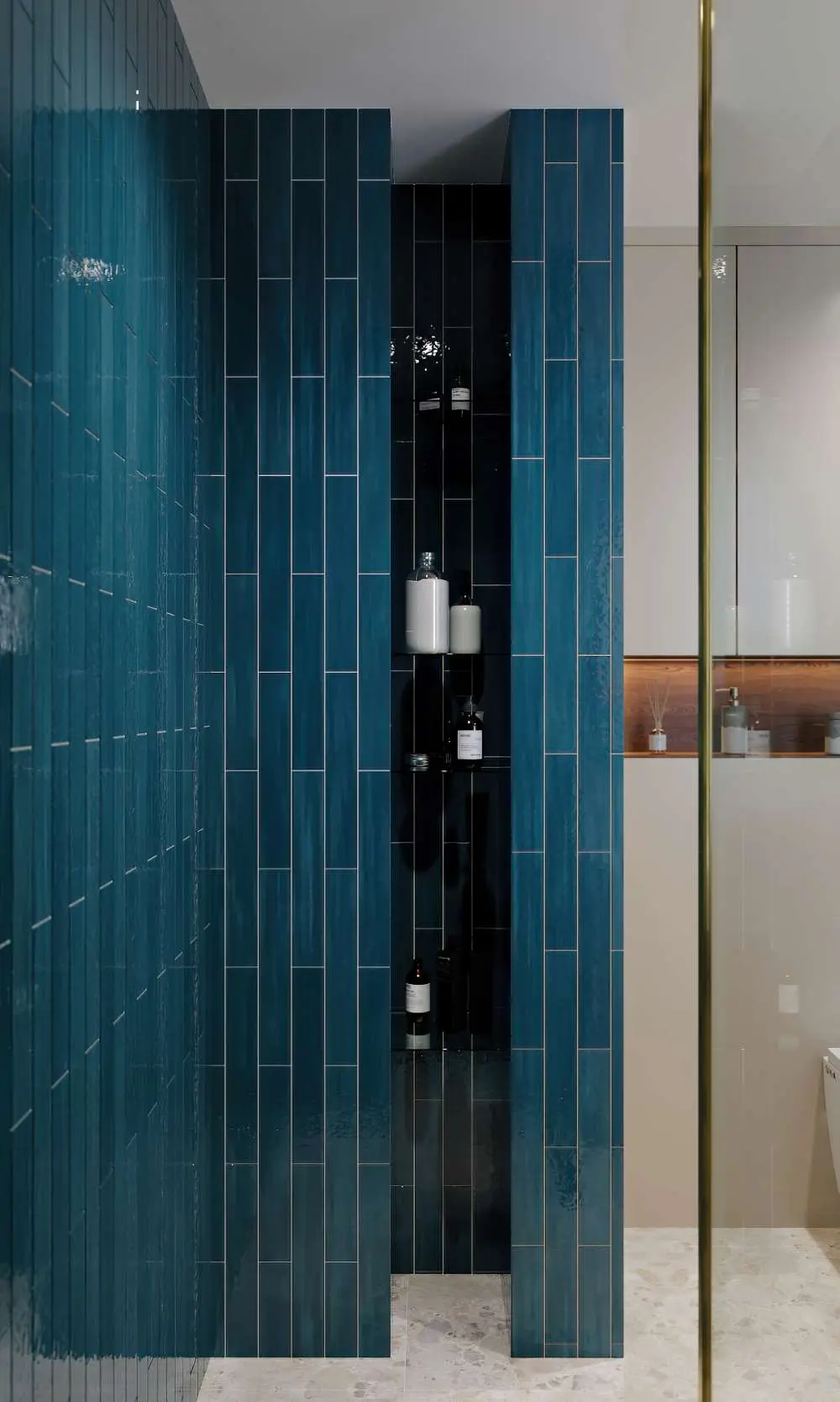 Łazienka dla gości miała być bardziej dekoracyjna. We wnęce prysznicowej zaprojektowano turkusowe płytki w formie cegiełek w orientacji pionowej, co optycznie podwyższa pomieszczenie. Elementy ślusarskie i wylewki zaproponowano w złotym wykończeniu. Tłem dla tych elementów są jasne płytki podłogowe, biały sufit oraz meble stolarskie, które wykończone zostały w takim samym kremowym kolorze co w łazience en suite.