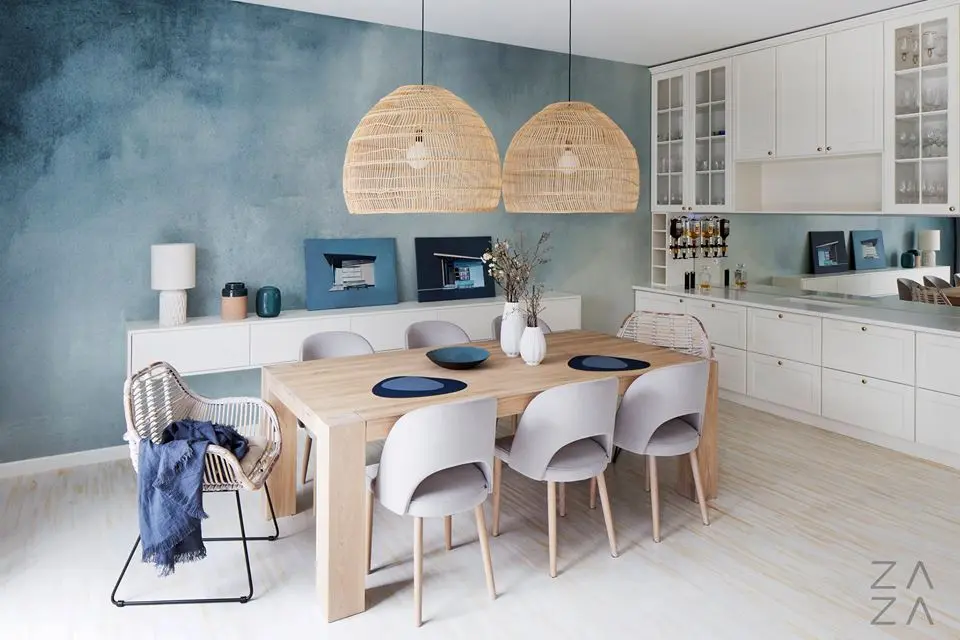 Ten wyjątkowy ciepły, ponadczasowy projekt wnętrza przykuł naszą szczególną uwagę ze względu na barwy, które zawsze wprowadzają nas w cudowny nastrój, ciepłych i słonecznych dni, niczym wakacje na wyspach. Miękkość, naturalność faktur we wnętrzu sprawia, że dom jest wyjątkowym azylem dla rodziny. Siedzisko przy oknie wprowadza nostalgiczny nastrój. Do aranżacji jadalni zostały wykorzystane krzesła, polskiej marki Fameg (cały asortyment dostępny w naszych salonach).