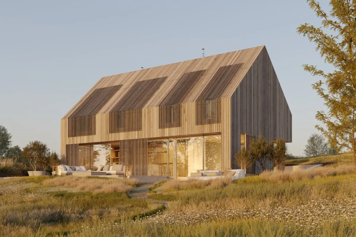 Pośród traw i drzew, w malowniczej scenerii Wielkopolski, powstało wyjątkowe założenie domu jednorodzinnego i sąsiadującego z nim kompleksu do glampingu. Jego autorkami są Ewelina Chawawko i Emilia Kaczor z pracowni Emwe, które przy tym projekcie współpracowały z HRT studio. Otaczająca przyroda miała dominujący wpływ na projekt domu oraz aranżacje wnętrz – architektki chciały, by natura podjęła dialog z budynkiem. Prosta forma stodoły nawiązuje do okolicznej zabudowy, a naturalne materiały takie jak kamień i drewno współgrają z otoczeniem. Jak podkreślają architektki: „dzięki zaufaniu, jakim obdarzyli nas Inwestorzy i wzajemnym inspirowaniu się, mogłyśmy stworzyć tak piękne miejsce.”.