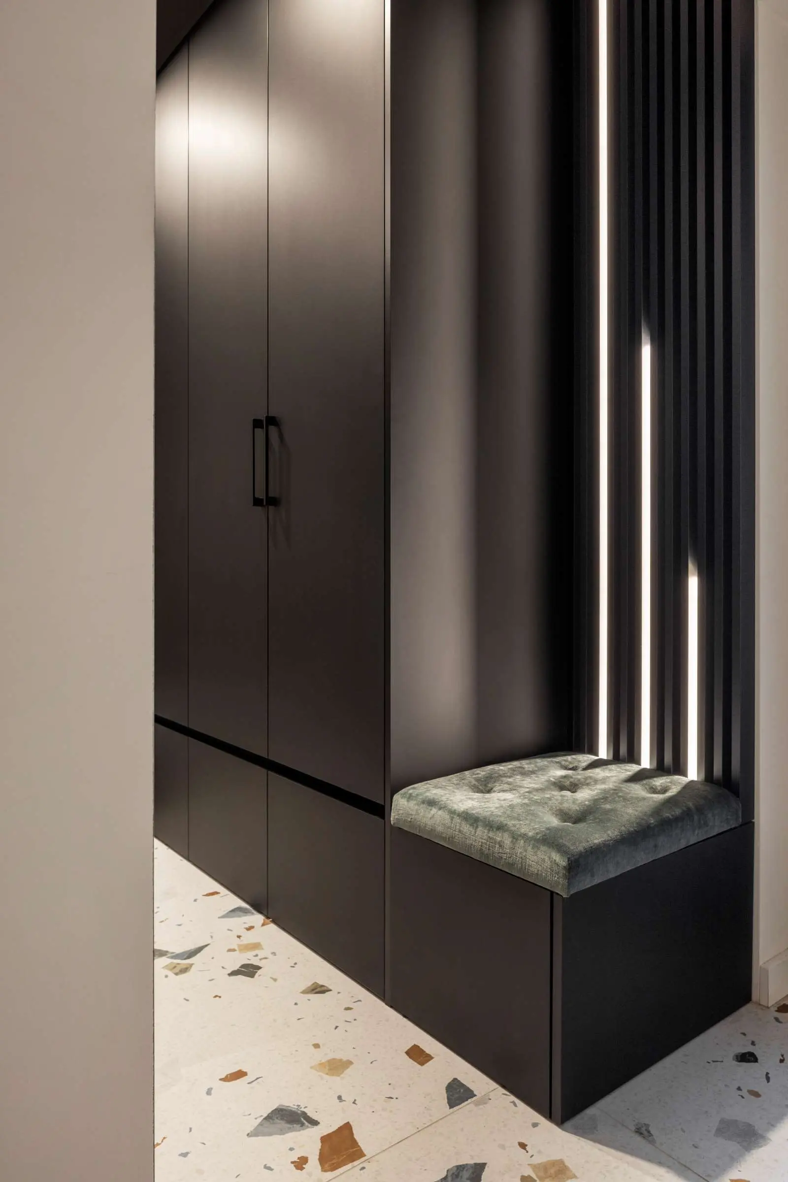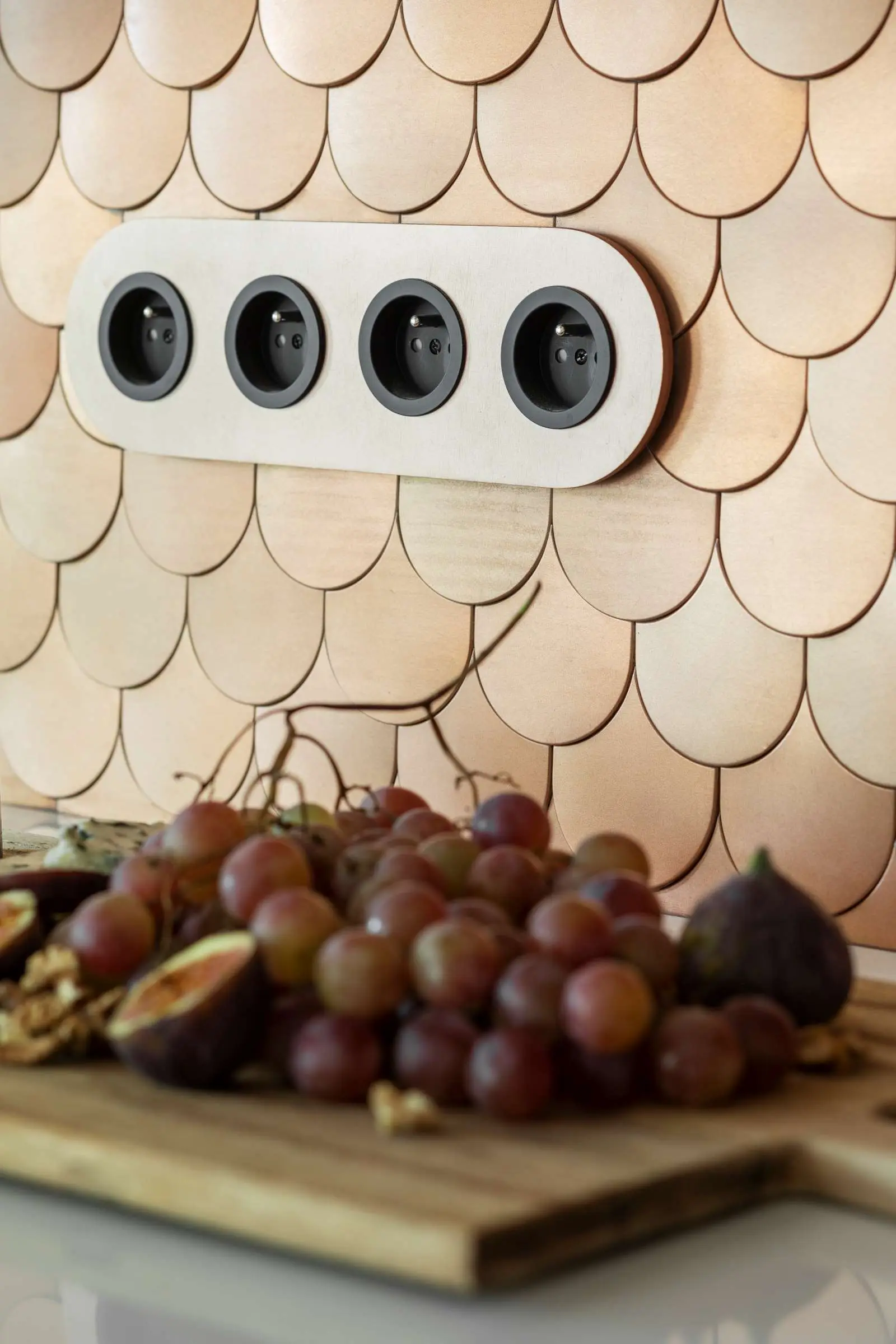 Właściciele domu lubią geometrię oraz różne faktury. Z tego względu architektki podkreśliły wszystkie obłe formy w domu (włączniki, stoliki, lampy, łuski itd.) wpisując dodatkowo fornirowany okrąg w lamele za sofą. Widać go dopiero wtedy, kiedy staniemy pod odpowiednim kątem – ze strefy jadalni widzimy tylko antracytowe lamelki.