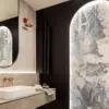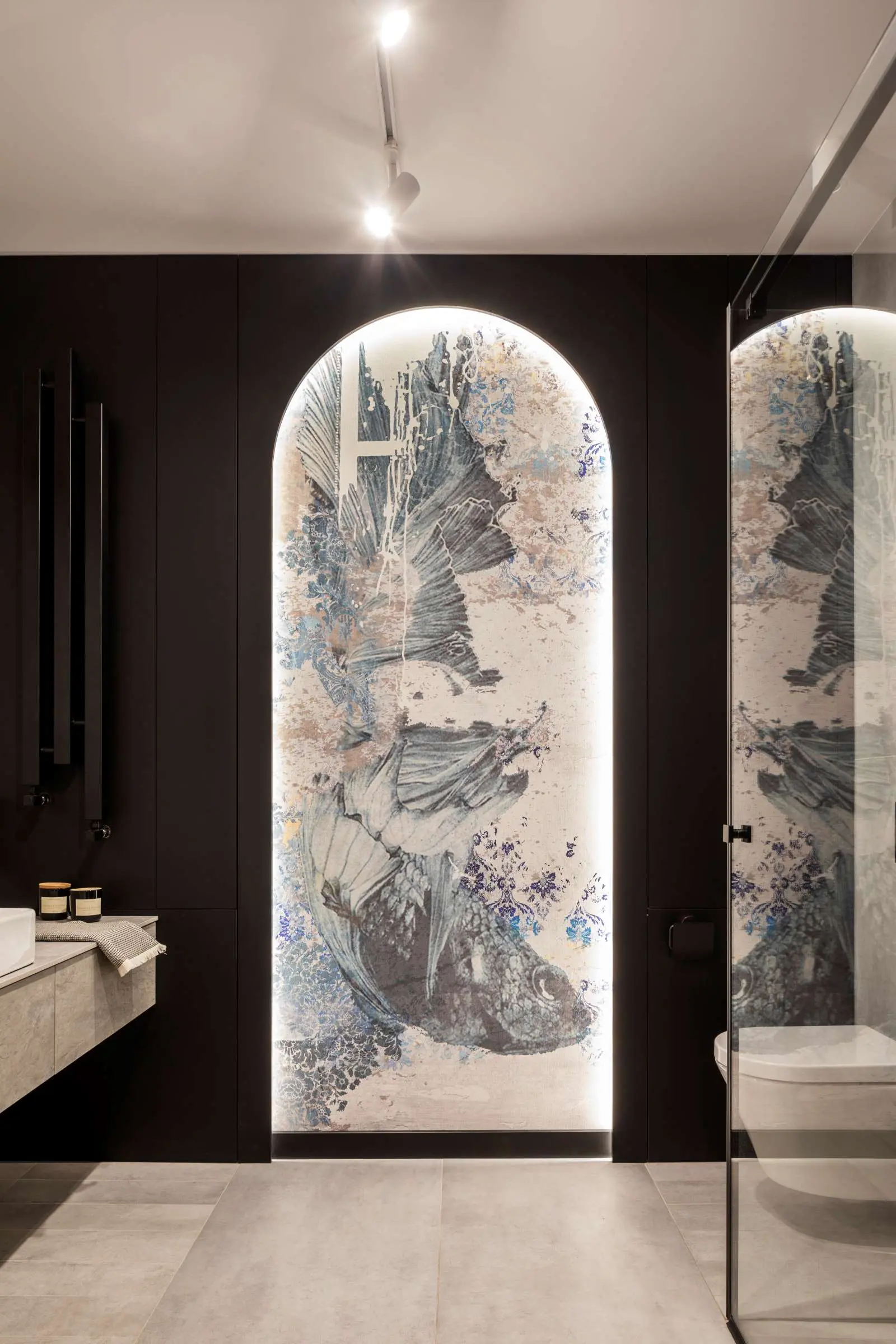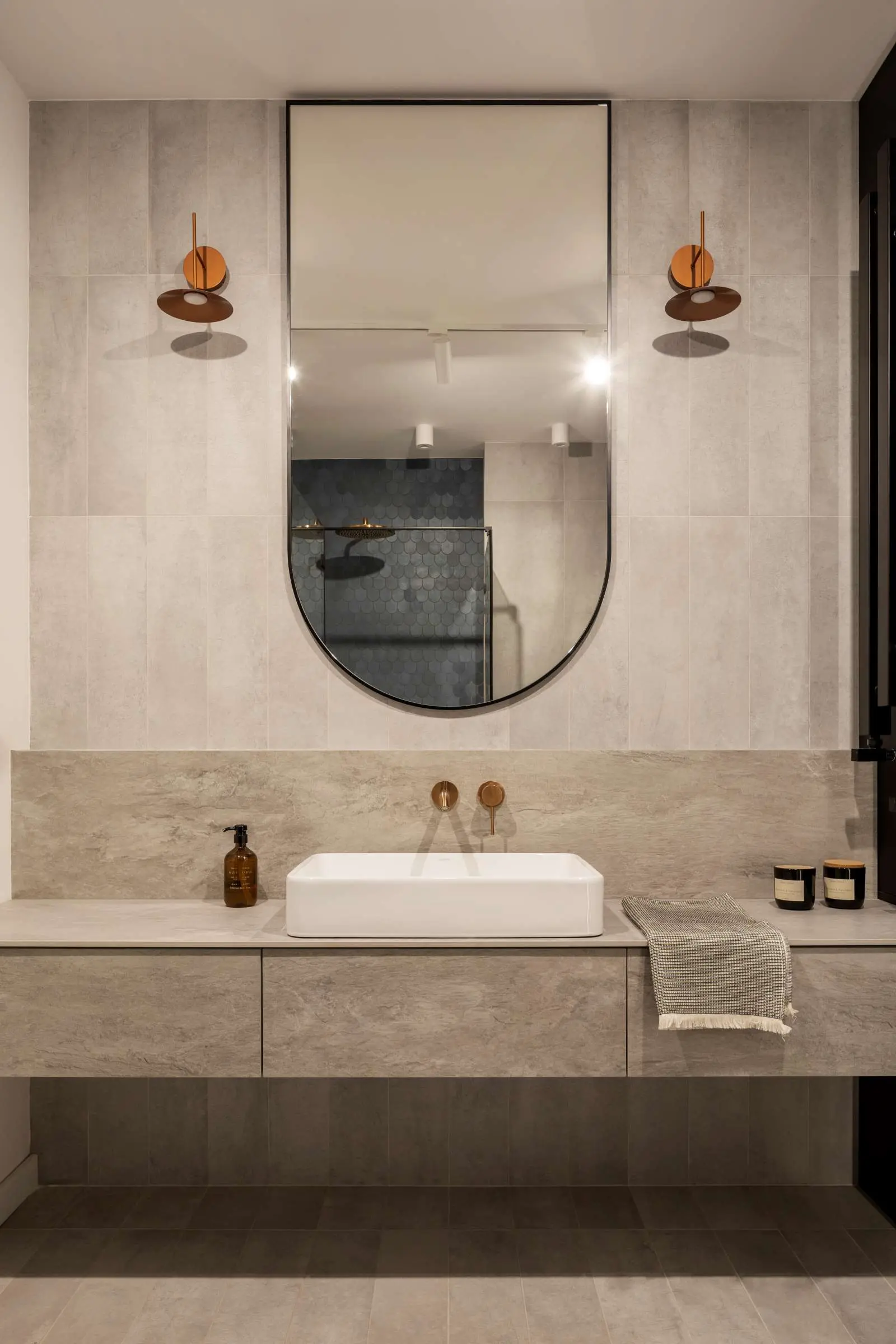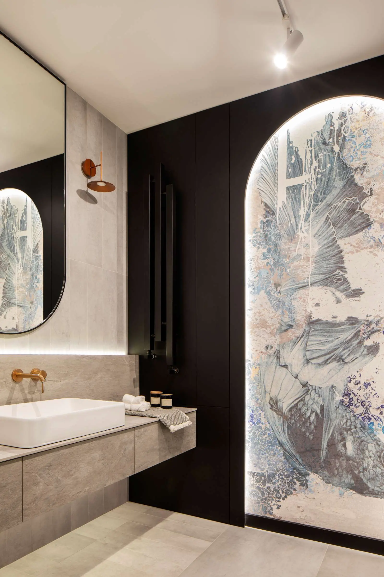 Wisienką na torcie jest łazienka gościnna. Inwestorzy dużo podróżują, marzeniem było, aby to wnętrze nawiązywało stylem do klimatu łaźni tureckiej. Z tego względu cała łazienka została wyłożona kamiennymi płytkami w odcieniach szarości. Na wejściu największe wrażenie robi podświetlona, orientalna tapeta w łuku. W przestrzeni prysznica znajdują się granatowe płytki w kształcie łuski nawiązujące do tych w kuchni. Blat oraz szuflady zostały wykonane ze spieku dobranego kolorystycznie do szarości płytek. Oczywiście nie zapomniano o miedzi – tym razem w tym materiale są kinkiety obok lustra.