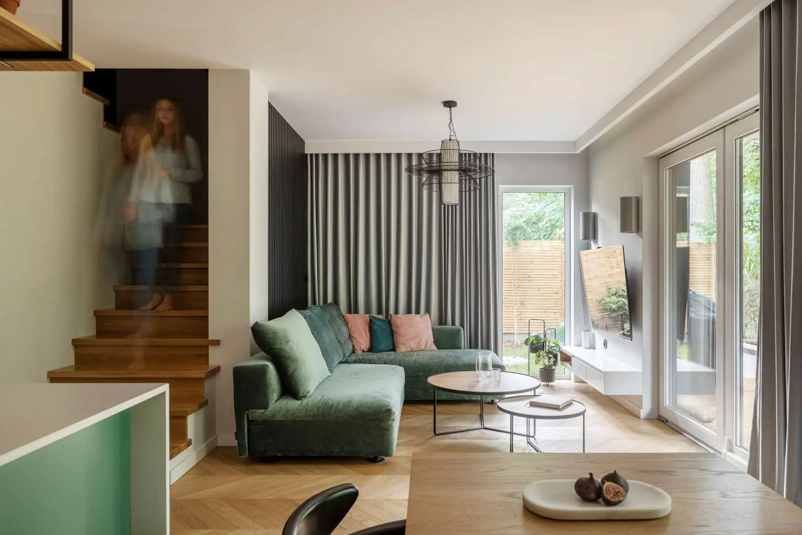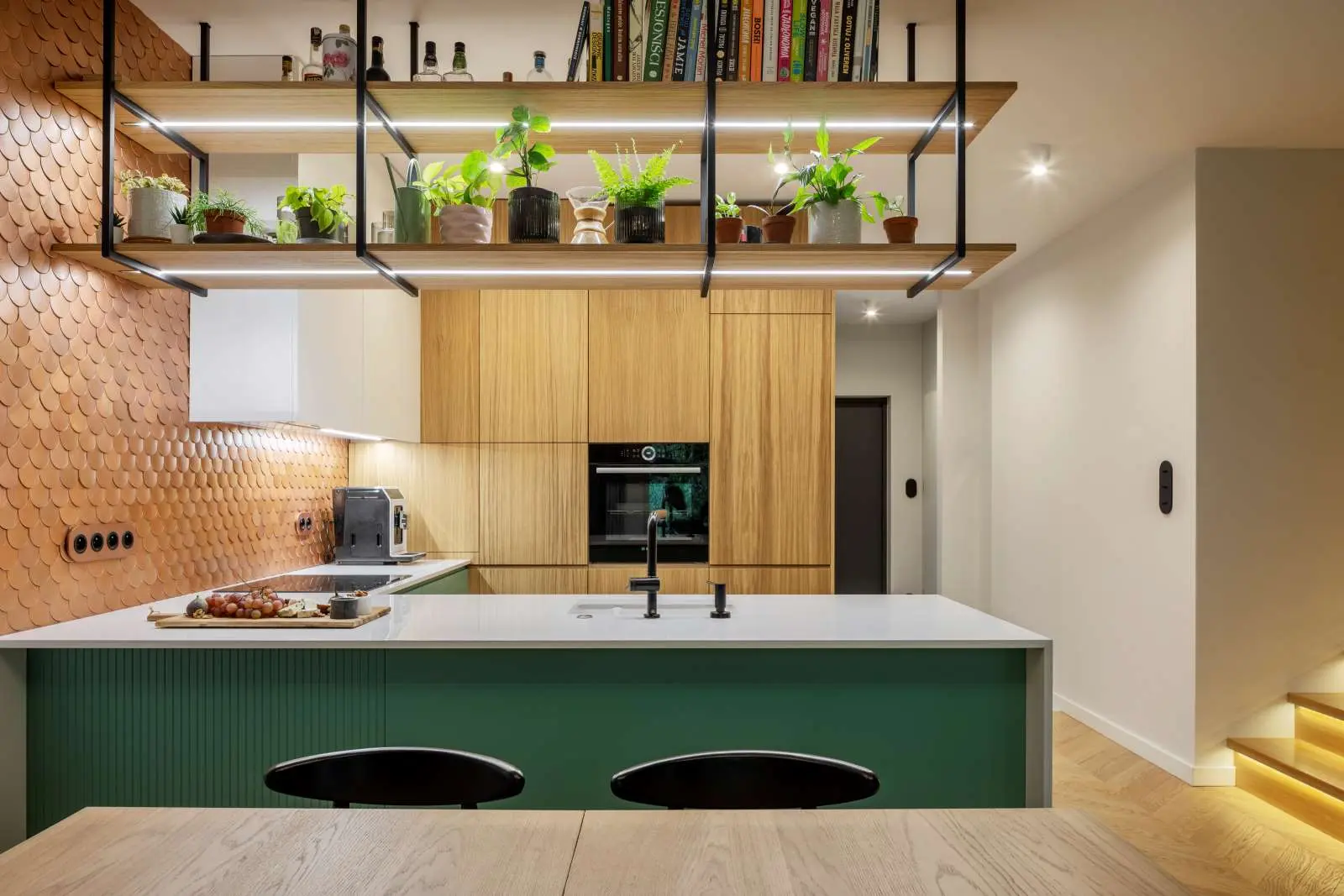 Głównym punktem przyciągającym uwagę jest miedziana ściana w kuchni. Inwestorzy uwielbiają ten materiał, z tego względu został on najbardziej wyeksponowany w nowoczesny, nietuzinkowy sposób. W kuchni, czyli w sercu domu pojawiła się łuska w tym odcieniu, do której perfekcyjnie pasuje odcień zieleni, granatu oraz różu. To kolory, które przenikają się ze sobą w całym domu.