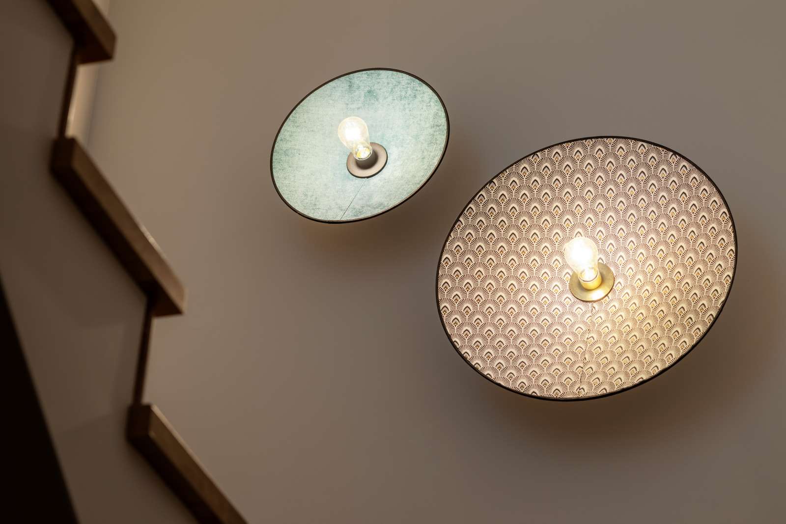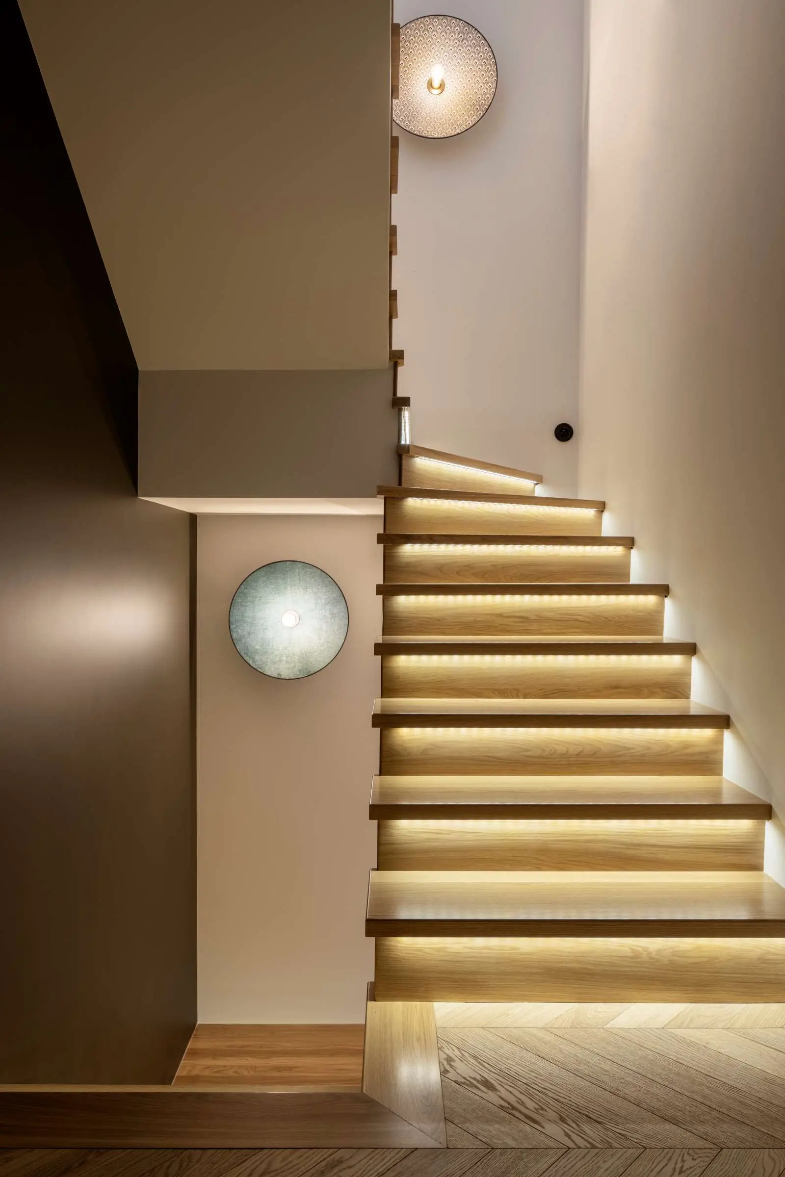Wchodząc na pierwsze piętro domu przekraczamy linię odpoczynku i wycieszenia. Dominują tu spokojne i naturalne barwy, które wprowadzają nas w stan relaksu. Klatka schodowa jest dosyć wąska, natomiast nawet w tej części został wprowadzony element zaskoczenia. Z tego względu ozdobami stały się przepiękne i kolorowe kinkiety marki MarketSet. W drodze na piętro towarzyszą im również ledy w podstopnicach. W całym domu zostały także zastosowane włączniki światła oraz gniazdka polskiej marki Vectis.