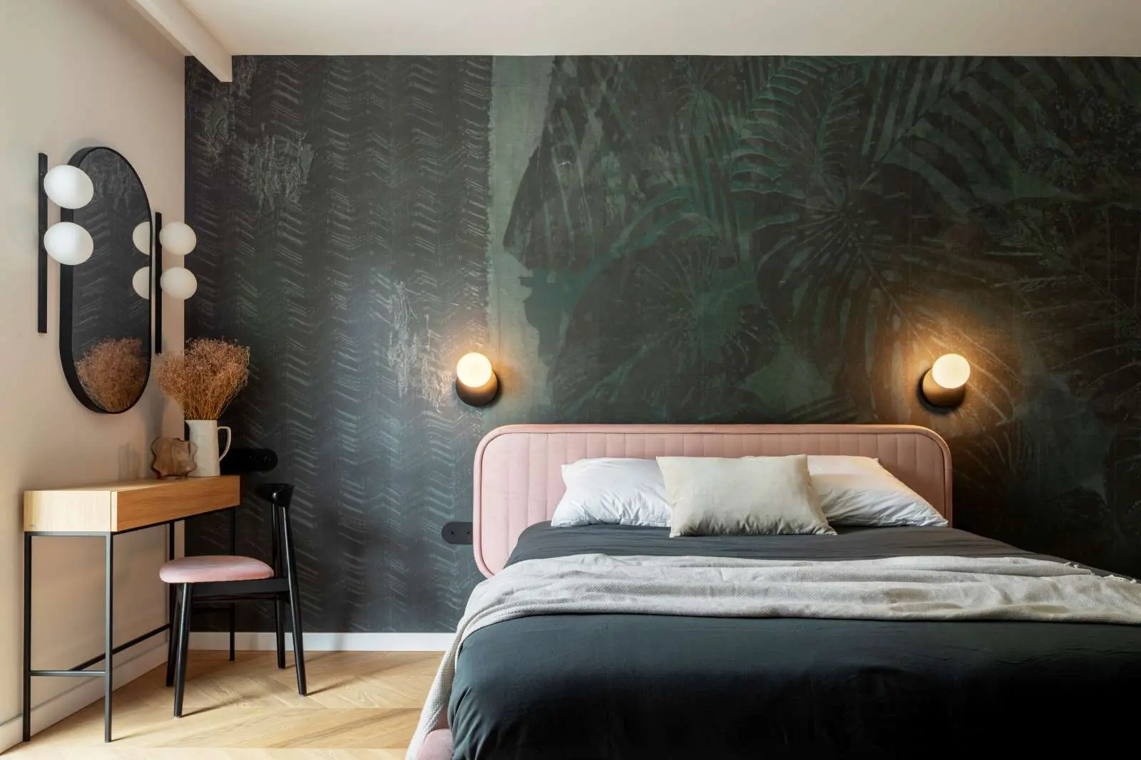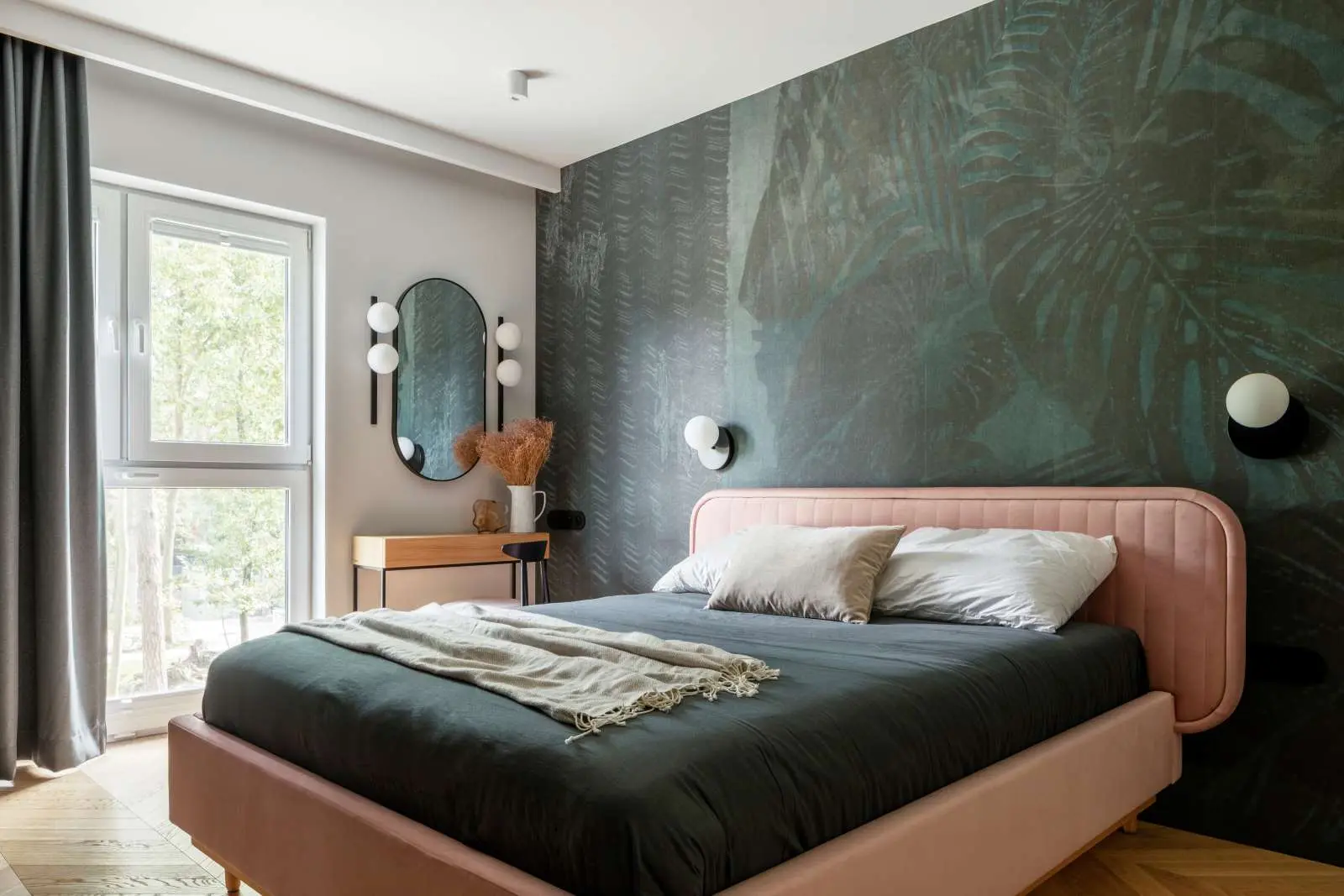 Sypialnia została połączona z garderobą oraz łazienką. W tym pomieszczeniu króluje duże, wygodne łóżko w kolorze różowej waty cukrowej. Wspaniale kolor i kształt łóżka koresponduje z zieloną, tropikalną tapetą Wall & Deco. Lampy również nawiązują klimatem i obłością do całego wnętrza.