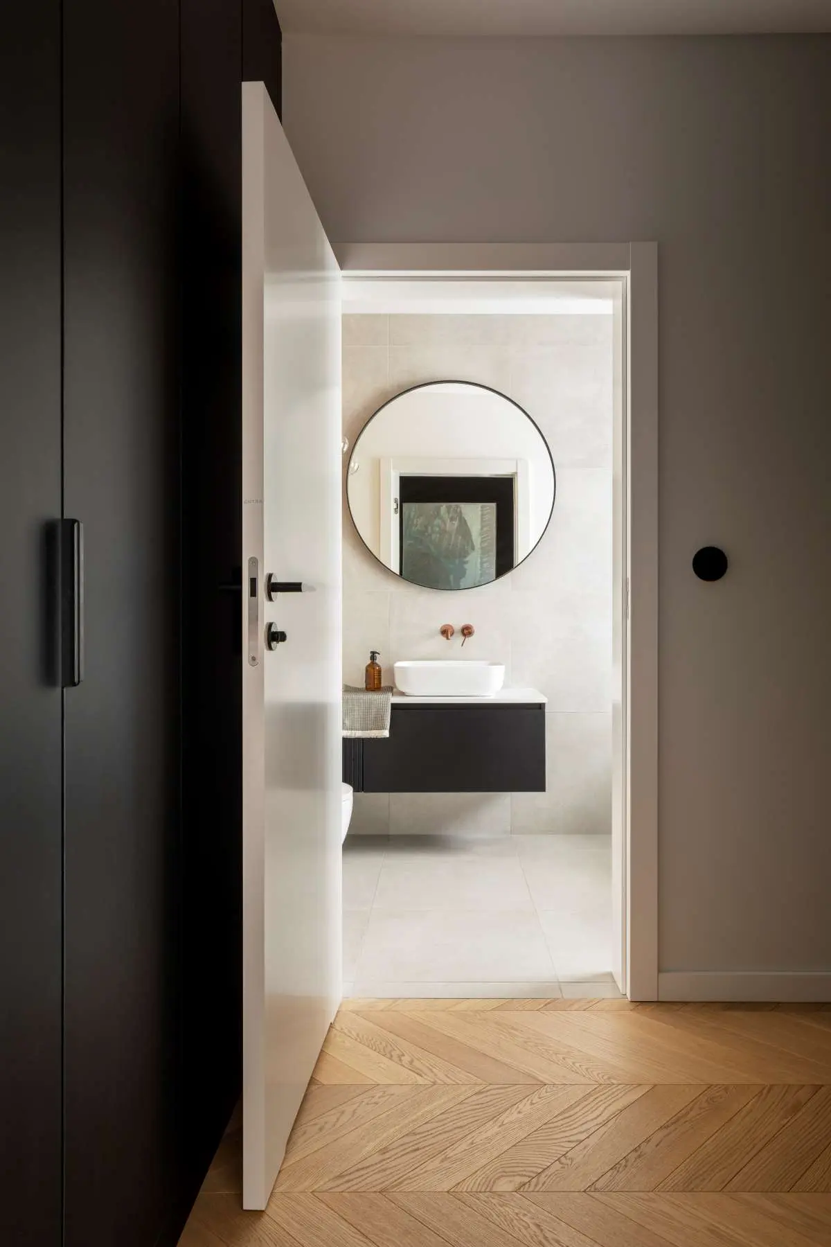 Łazienka przy sypialni, jest zdecydowanie odmienna od pozostałych wnętrz. Zaprojektowano w niej wolnostojącą wannę, klimatyczne oświetlenie oraz stonowane płytki. Mocnym akcentem w tym wnętrzu jest antracytowa płytka ułożona w jodełkę w strefie wannowej. Z tego względu w tym pomieszczeniu mamy dużą ilość klimatycznego oświetlenia, przy którym można odpocząć w wolnostojącej wannie. Nie zabrakło również miedzianych elementów, w tej łazience wybrano baterie marki Gessi.