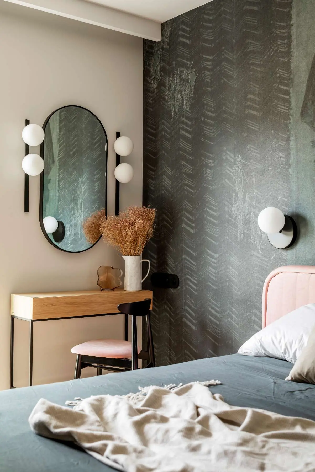 Tapeta w sypialni z różowym łóżkiem