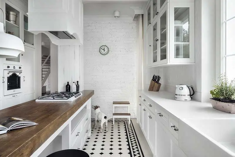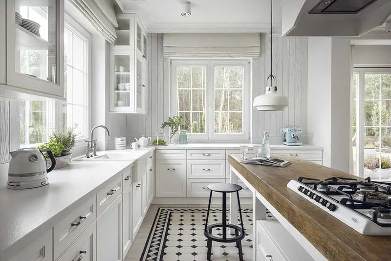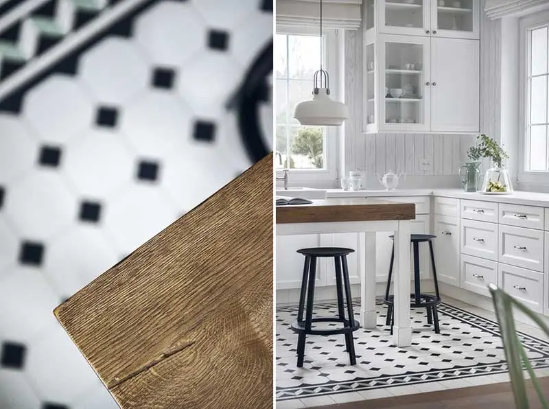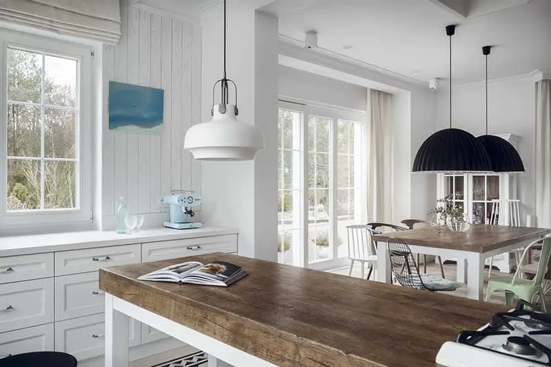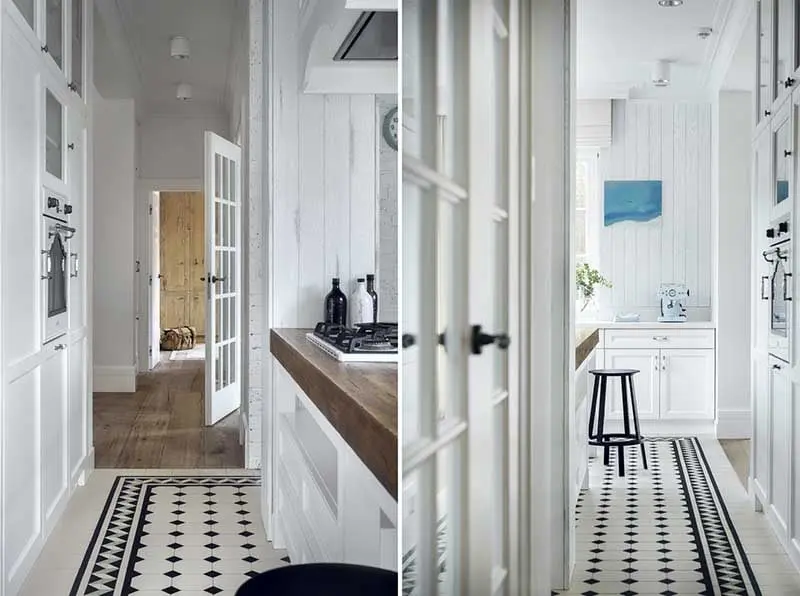 Przestronny apartament w stylu klasycznym z designerskimi akcentami, to projekt pracowni Mana Design. Mnie ta realizacja urzekła przede wszystkim piękną, klasyczną kuchnią, która niewątpliwie jest sercem tego domu. Tradycyjne drewniane meble nabrały nowoczesnego charakteru, dzięki ich białemu wybarwieniu, a cała sfera kuchenna ma jeszcze ciekawszy wygląd, dzięki wzorzystej podłodze.