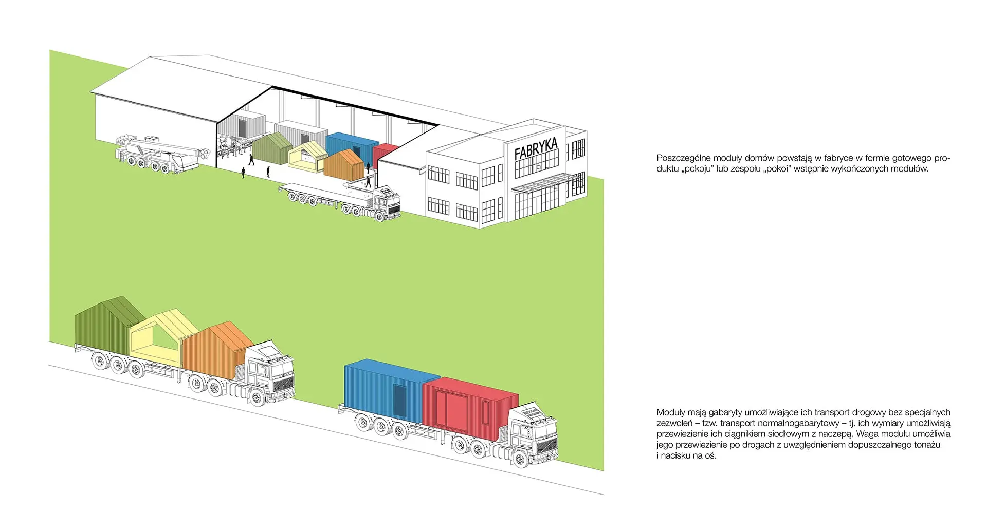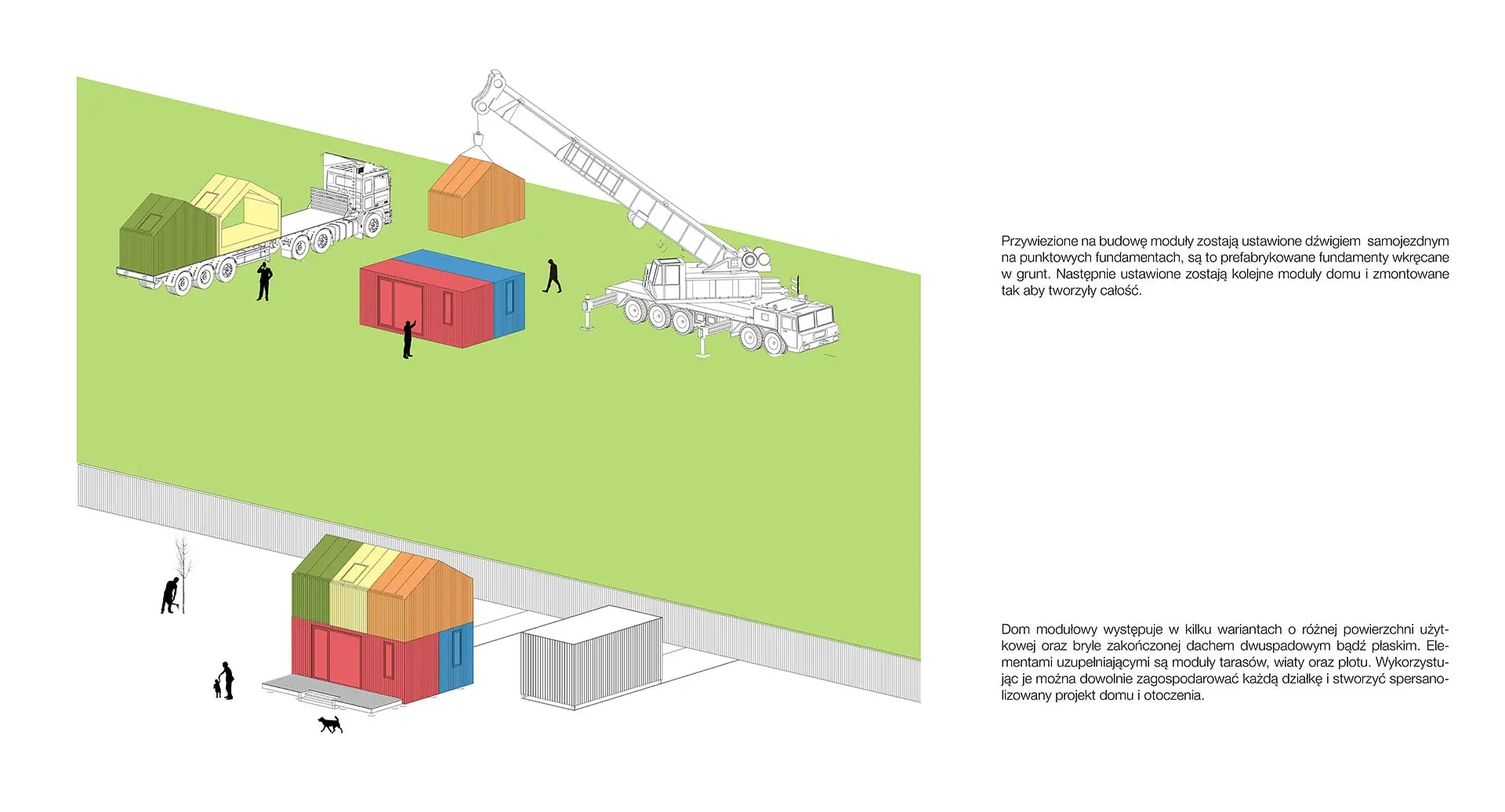 Wymiary modułów: szerokość 2,50 m i 3.10 m oraz do 12 m długości. Moduły mają gabaryty umożliwiające transport drogowy bez specjalnych zezwoleń. Moduły można dowolnie konfigurować tworząc różne obiekty architektoniczne. Do tej pory opracowaliśmy pięć wariantów, każdy w kilku opcjach kolorystycznych. W planach jest przygotowanie kolejnych wariantów.