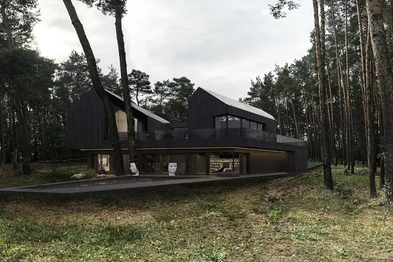 Inwestorzy obdarzyli architekta sporym zaufaniem, dając mu praktycznie wolną rękę. Jednak lokalizacja domu miała ogromne znaczenie dla całej wizji, gdyż bryła miała być uzupełnieniem otoczenia, idealnie się w nie wpisując. Drewniana fasada i jej ciemne wykończenie spowodowały, że cały obiekt wkomponował się w otaczającą go naturę. Fasada domu od zewnątrz sprawia wrażenie, że stoi się przed dwoma budynkami w typie stodoły, połączonych przeszklonym fragmentem. „Ta dwupoziomowa budowla z dwuspadowym dachem swoją formą opiera się o istniejący dom, jednak różnica w odbiorze jest diametralna. Bryłę tworzą dwie stodoły połączone łącznikiem, obydwie ściśle do siebie nawiązują. Pościnane, szklane narożniki unowocześniły bryłę, z kolei okna w narożnikach to element dodany, z którego rozpościera się piękny widok na las” – mówi architekt Marcin Tomaszewski z pracowni REFORM Architekt. Samo nawiązanie do popularnych obecnie stodół było zabiegiem pozwalającym stworzyć pewną strefowość we wnętrzach, dzięki czemu w środku jest wiele otwartych przestrzeni z wyraźnie zaznaczoną funkcją.
