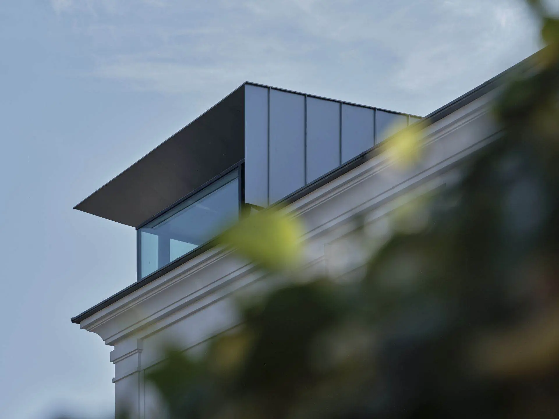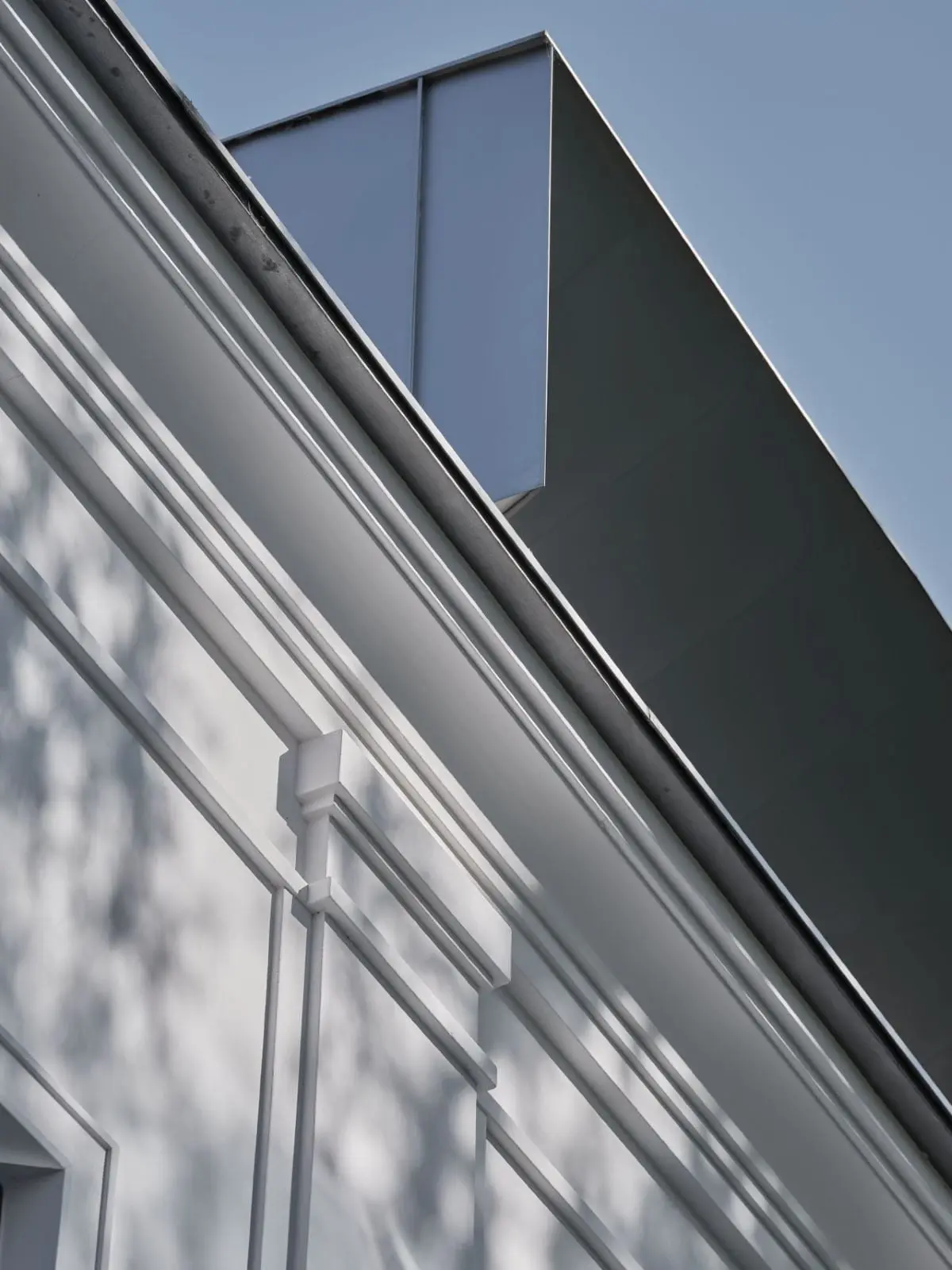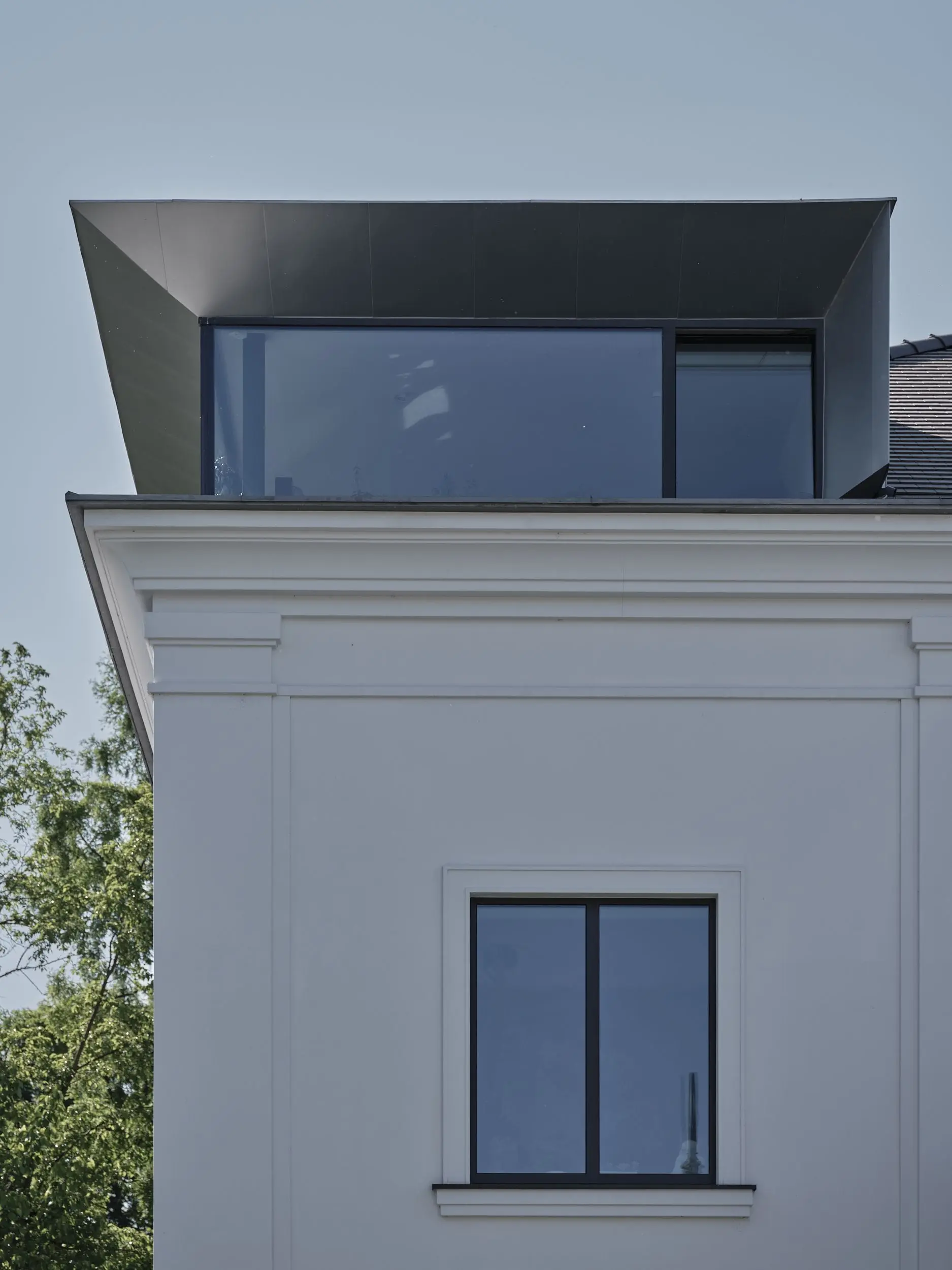Pracownia zaproponowała odważną drogę, czyli nasycenie elewacji detalem i nakrycie całego domu ciemnym, współcześnie wyglądającym dachem, z bardzo nowoczesnymi lukarnami. W ten sposób zbudowano rodzaj napięcia pomiędzy klasycznym charakterem miejsca i nowoczesnym podejściem projektowym. Inspirację do nowej elewacji architekci znaleźli w okolicznej architekturze z lat 20. i 30., począwszy od oprawy okien ramką sztukateryjną, przez powszechne gzymsy koronujące i kordonowe, po wyróżniające się pilastry. Zmiany umożliwiły ukształtowanie bryły budynku na nowo i optyczną zmianę jego proporcji. Z przodu stworzono nowy garaż, obłożony tak jak lukarny blachą aluminiową. Z tyłu budynku powstał natomiast nowoczesny ogród zimowy. Dom wyposażono w minimalistyczną ślusarkę aluminiową w ciemnym kolorze, szyby pokryto specjalną ekologiczną powłoką, ograniczającą nagrzewanie wnętrza, a na dachu zamontowano ogniwa fotowoltaiczne.
