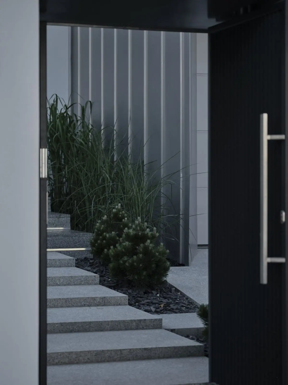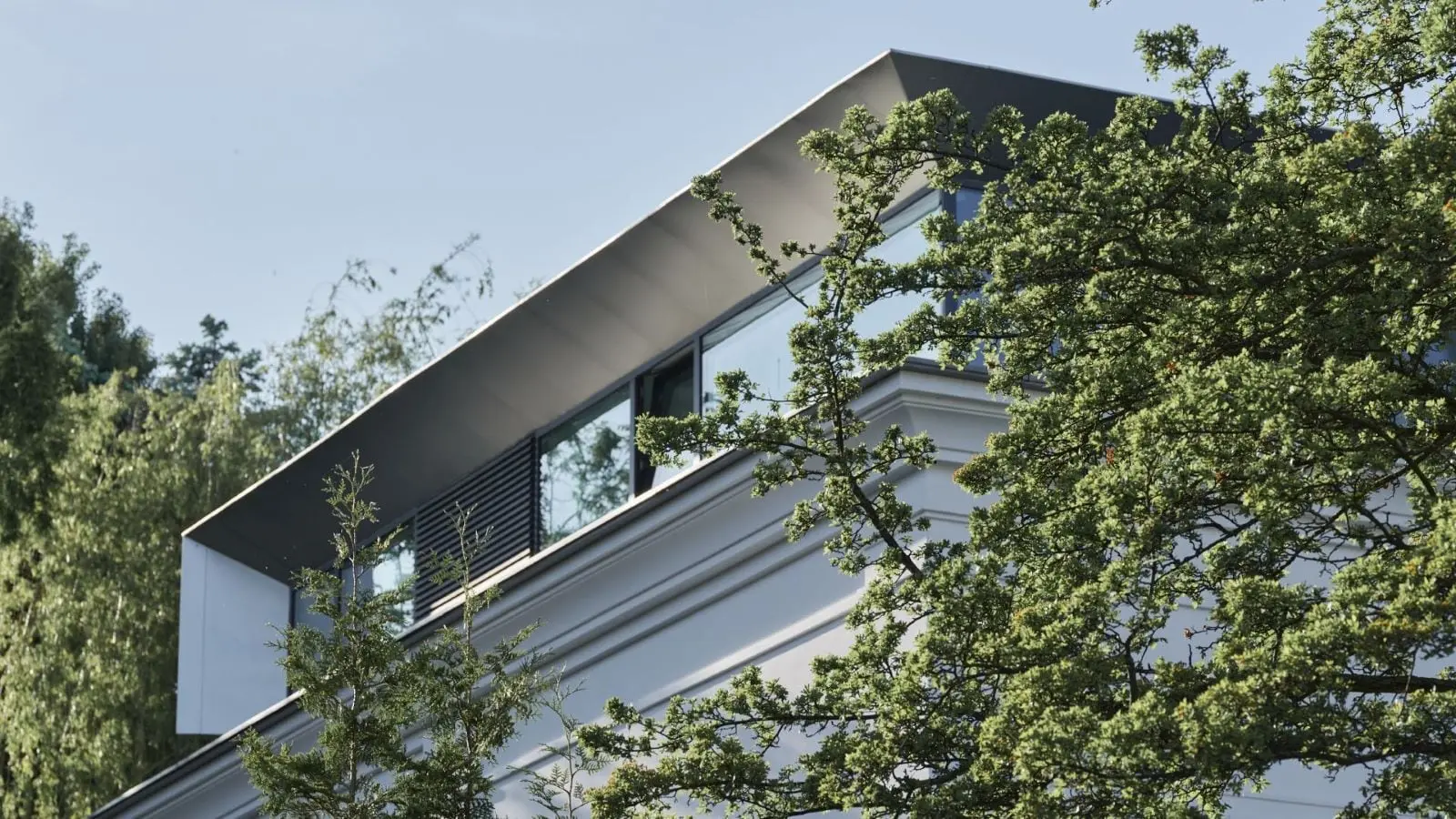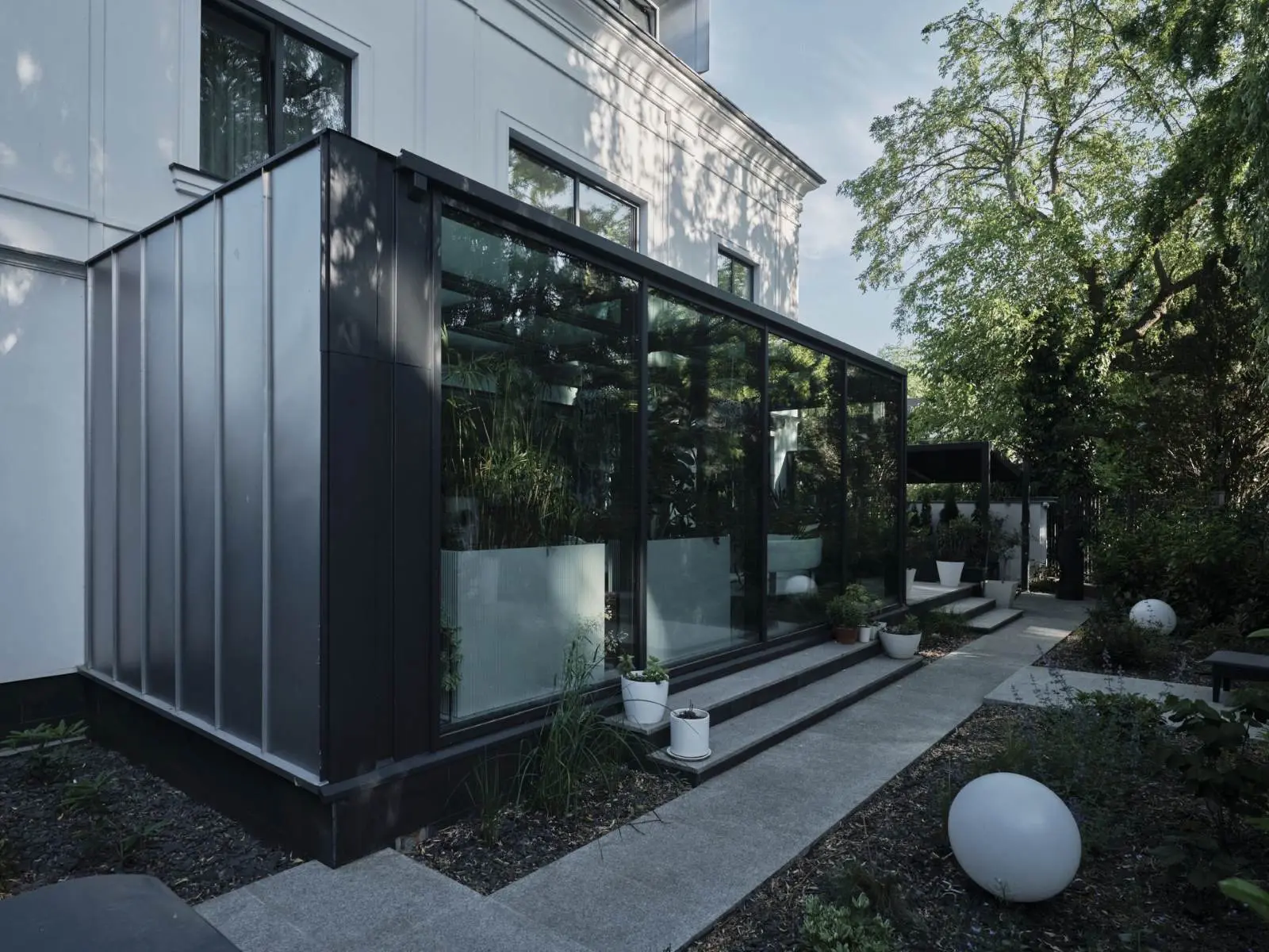 Pracownia zaproponowała odważną drogę, czyli nasycenie elewacji detalem i nakrycie całego domu ciemnym, współcześnie wyglądającym dachem, z bardzo nowoczesnymi lukarnami. W ten sposób zbudowano rodzaj napięcia pomiędzy klasycznym charakterem miejsca i nowoczesnym podejściem projektowym. Inspirację do nowej elewacji architekci znaleźli w okolicznej architekturze z lat 20. i 30., począwszy od oprawy okien ramką sztukateryjną, przez powszechne gzymsy koronujące i kordonowe, po wyróżniające się pilastry. Zmiany umożliwiły ukształtowanie bryły budynku na nowo i optyczną zmianę jego proporcji. Z przodu stworzono nowy garaż, obłożony tak jak lukarny blachą aluminiową. Z tyłu budynku powstał natomiast nowoczesny ogród zimowy. Dom wyposażono w minimalistyczną ślusarkę aluminiową w ciemnym kolorze, szyby pokryto specjalną ekologiczną powłoką, ograniczającą nagrzewanie wnętrza, a na dachu zamontowano ogniwa fotowoltaiczne.