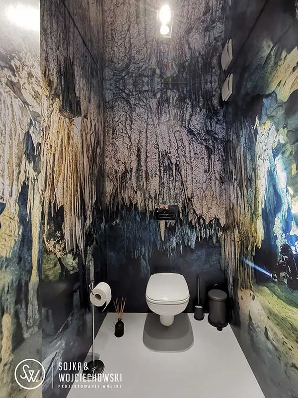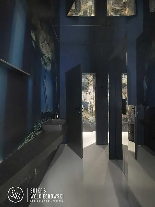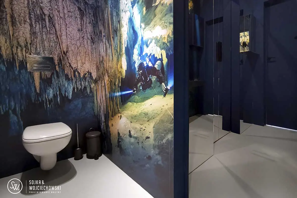 Mimo niewielkiej powierzchni kubiku w którym znajduje się zaplecze, efekt w sterylnym wnętrzu jest piorunujący. Dodatkowo WC we wnętrzu zostało wytapetowane zdjęciami wybitnej nurkowej fotografki Ireny Stangierskiej, a efekt bycia pod wodą spotęgowały lustra przyklejone do sufitu. Ostatnim pomieszczeniem w lokalu jest znajdujące się za potężnymi, przesuwnymi drzwiami laboratorium. Surowego, sterylnego efektu dopełnia, nie otynkowany sufit z instalacją elektryczną poprowadzoną na wierzchu.