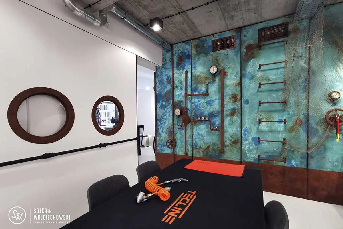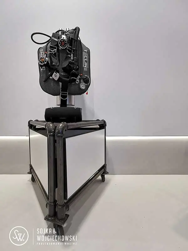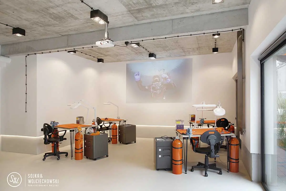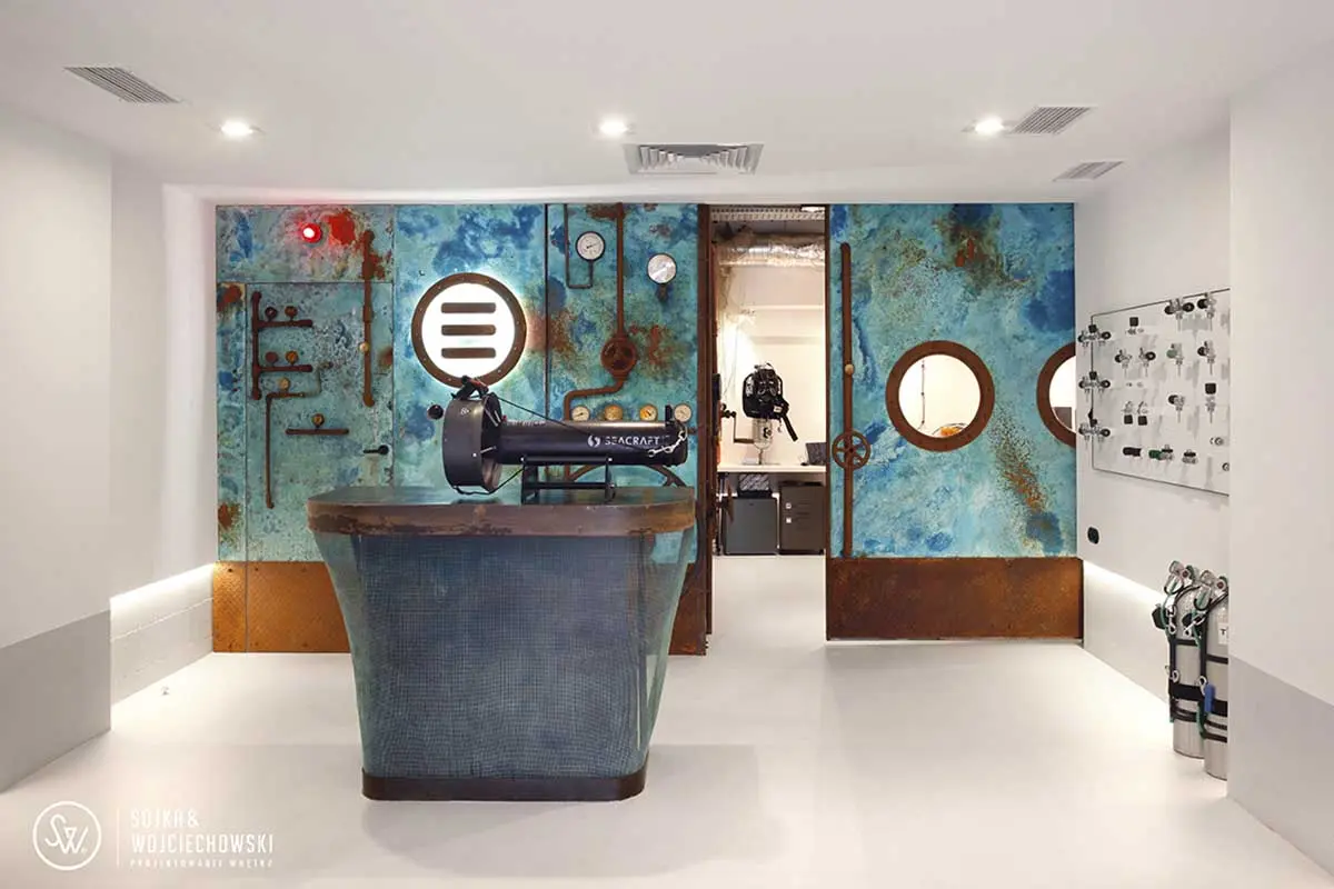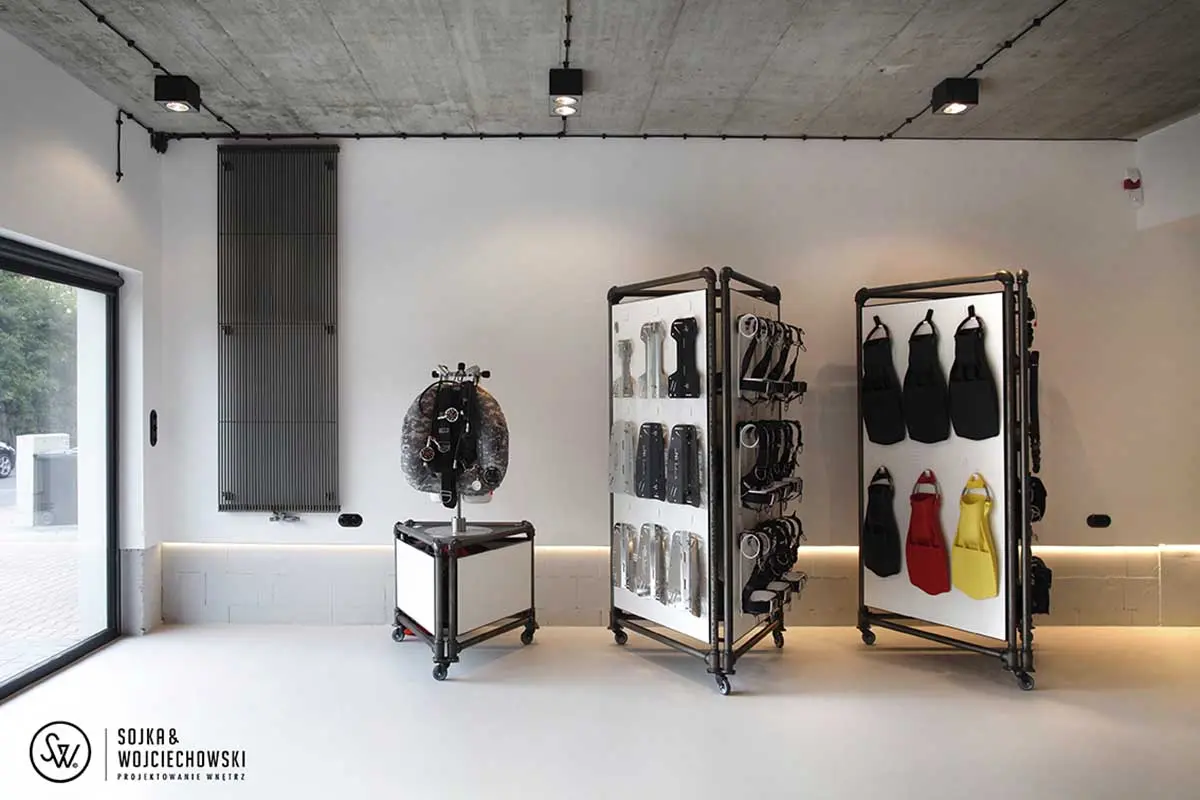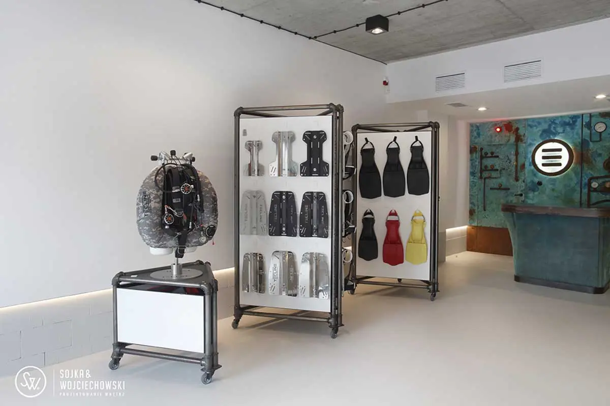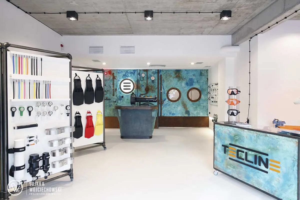 Tym razem utalentowany zespół architektów Sojka & Wojciechowski podjął się aranżacji dość nietypowego wnętrza Tecline. Firma, zatrudnia wysokiej klasy specjalistów, którzy opracowują na jej zlecenie każdy element niezbędny do profesjonalnego nurkowania, zaczynając od płetw i masek na zaworach, manometrach, a nawet bojkach nurkowych kończąc. Ich asortyment jest ogromny. Miejsce, które chcieli stworzyć nie miało być w żadnym razie sklepem, raczej przestrzenią do prezentacji produktów, ale również prowadzenia szkoleń.