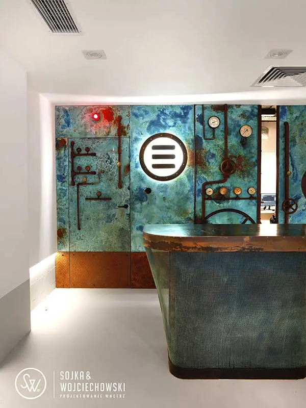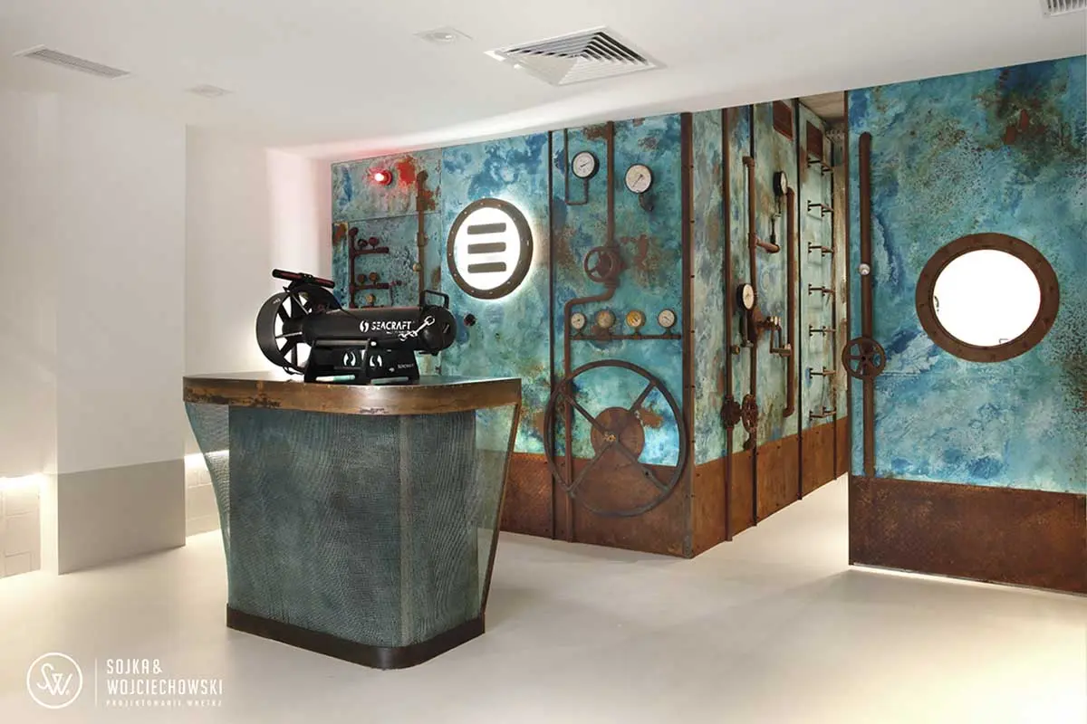 Głównym elementem jest jednak kubik skrywający zaplecze socjalne i toaletę. Żeby go zamaskować został obłożony specjalnie trawioną miedzią do której przykręcone zostały manometry, koła i rury imitujące wrak zatopionego okrętu podwodnego. Święty gral nurków. Inwestorzy zwrócili uwagę, że wrak nie powinien być zardzewiały, wtedy oznaczało by to, że został już wyciągnięty na brzeg i nie jest już niczym interesującym. Wraki, które są pod wodą mają specyficzną turkusową barwę, obrośniętą nalotem. Firma wykonująca zabudowę zrobiła wiele prób trawienia blachy i miedzi do uzyskania właściwego efektu, który wszystkich zadowolił.