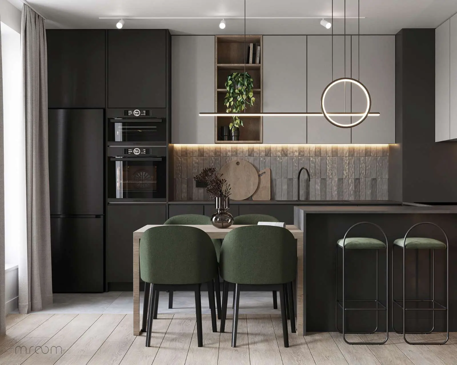 Kuchnia otwarta na salon pozwala stworzyć przestronną i wygodną strefę dzienną w mieszkaniu. Od salonu została oddzielona funkcjonalną wyspą i stołem z czterema zielonymi tapicerowanymi krzesłami.