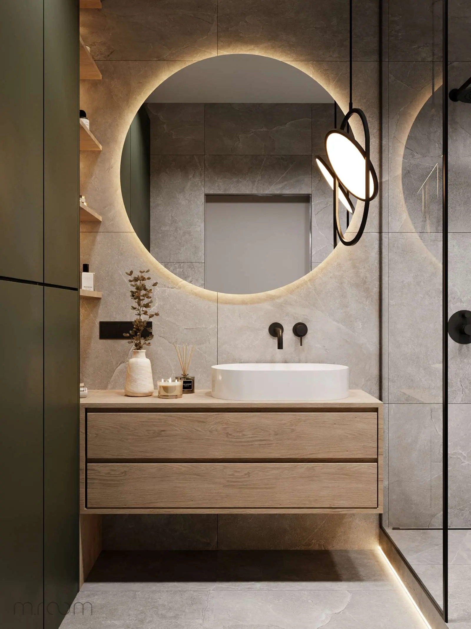 Łazienka tworzy spójną koncepcję do całego mieszkania. Widzimy konsekwencję w wyborze kolorystyki oraz materiałów. Płytkami architekt wydzieliła strefy. Strefa umywalkowa z dużym okrągłym lustrem została wyłożona szarymi, przecieranymi płytkami. Te same płytki znajdują się również w strefie prysznicowej.