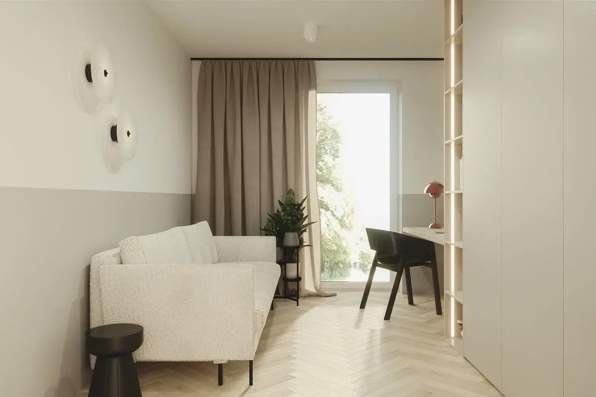Projekt dwupoziomowego mieszkania w prestiżowej dzielnicy Katowic – Brynów, powstał dla młodej Inwestorki. Zgodnie z potrzebami i wytycznymi właścicielki, podział funkcjonalny został przeprowadzony nieco niestandardowo – na poziomie pierwszym mieści się część prywatna z sypialnią, natomiast na piętrze zaaranżowano strefę dzienną, przez którą można wyjść na duży taras. Założeniem było stworzenie przytulnej i nowoczesnej przestrzeni z nutą japandi. Za koncept odpowiada Magdalena Dzierzon z pracowni Magic Interior Design, która ściśle współpracuje z Internity Home w Katowicach.
