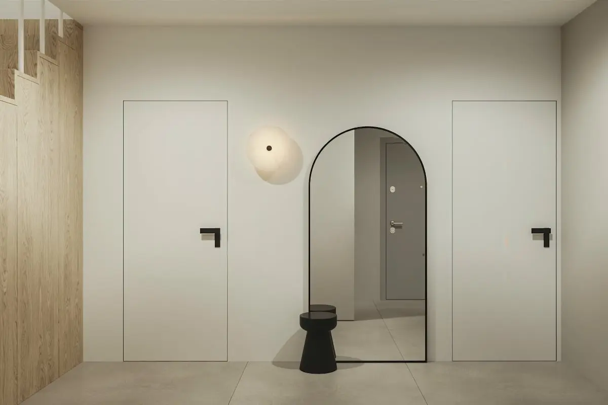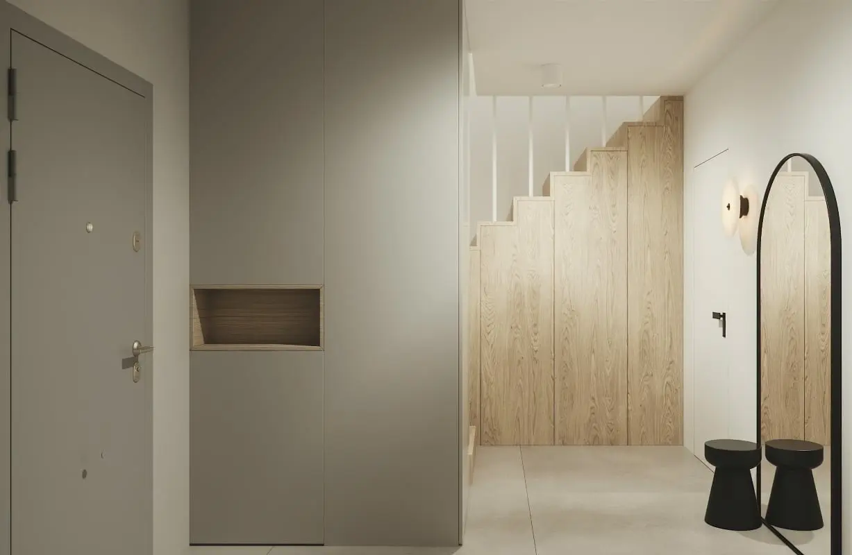 Zgodnie z życzeniem Inwestorki, przyjęty rozkład pomieszczeń ze strefą dzienną na pierwszym poziomie oraz wypoczynkową na drugim, został zamieniony miejscami. Przestronny hol prowadzi do sypialni głównej, pokoju gościnnego oraz łazienki. Już strefa wejścia zapowiada, co czeka w dalszej części mieszkania: naturalna kolorystyka, tekstury kamienia, drewno oraz miękkie tkaniny. Zgodnie ze wschodnią filozofią projektowania, we wnętrzu znajdują się jedynie niezbędne meble, a element dekoracyjny wprowadzają faktury, designerskie oświetlenie oraz organiczne formy.