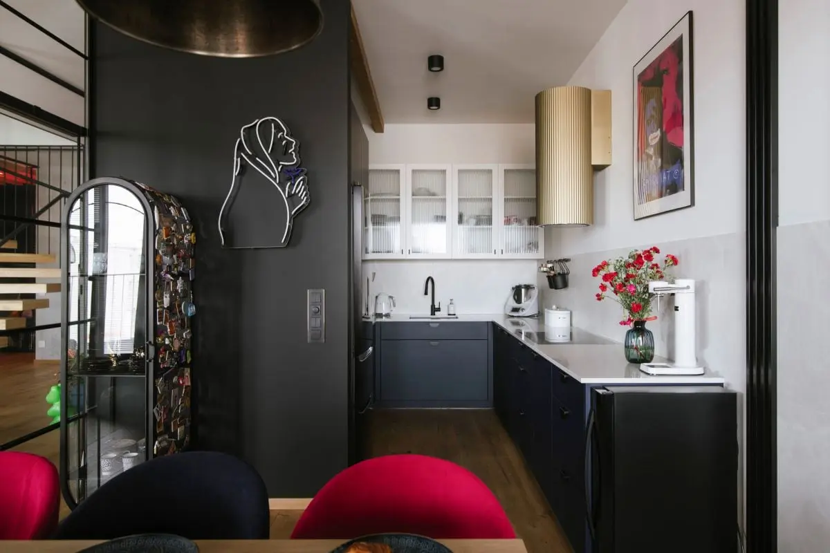Mieszkanie swoim klimatem nawiązuje do stylu industrialnego, który został ocieplony welurowymi krzesłami w odważnych kolorach megenty oraz granatu. Właścicielka mieszkania jest osobą dynamiczną lubiąca podróże oraz miłe spotkania z przyjaciółmi. Jest pasjonatką sztuki, nowoczesnego designu oraz Street Artu. Dlatego wnętrze jest urządzone odważnie, z przyjemnym klimatem klubowym, na ścianach zawisły również neony.