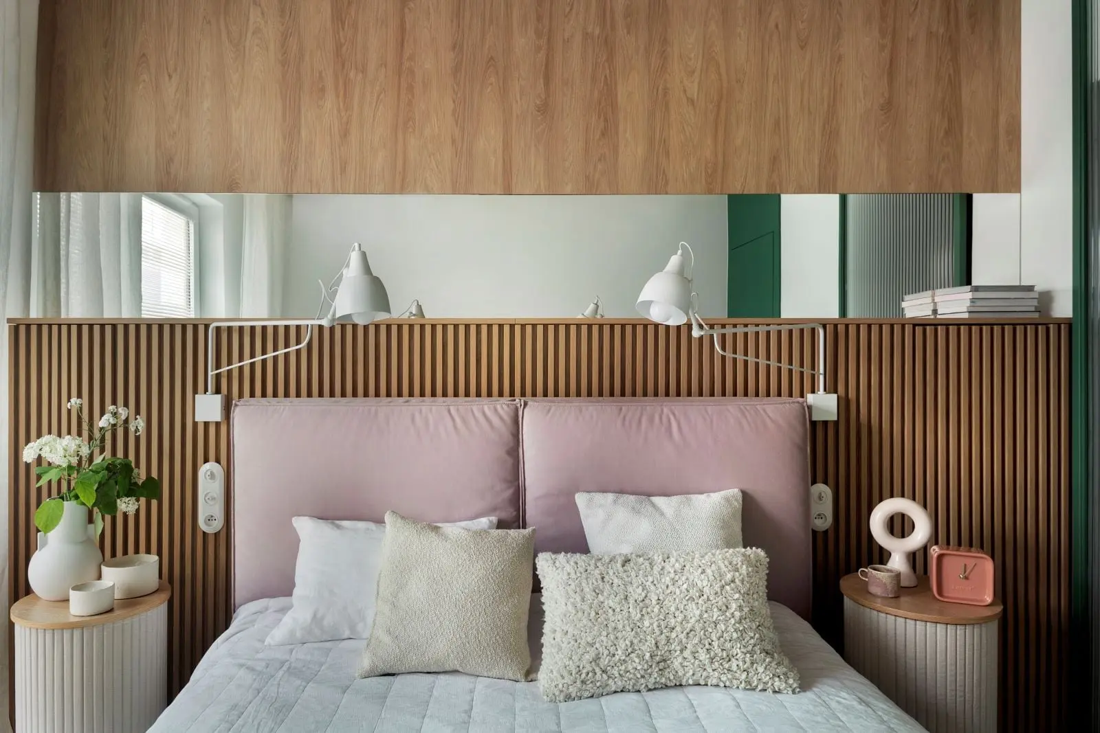 Pokój sypialniany całkowicie wpisuje się w harmonijnie zaprojektowane mieszkanie. Ciekawym akcentem jest różowy zagłówek, drewno oraz lustro nad łóżkiem.