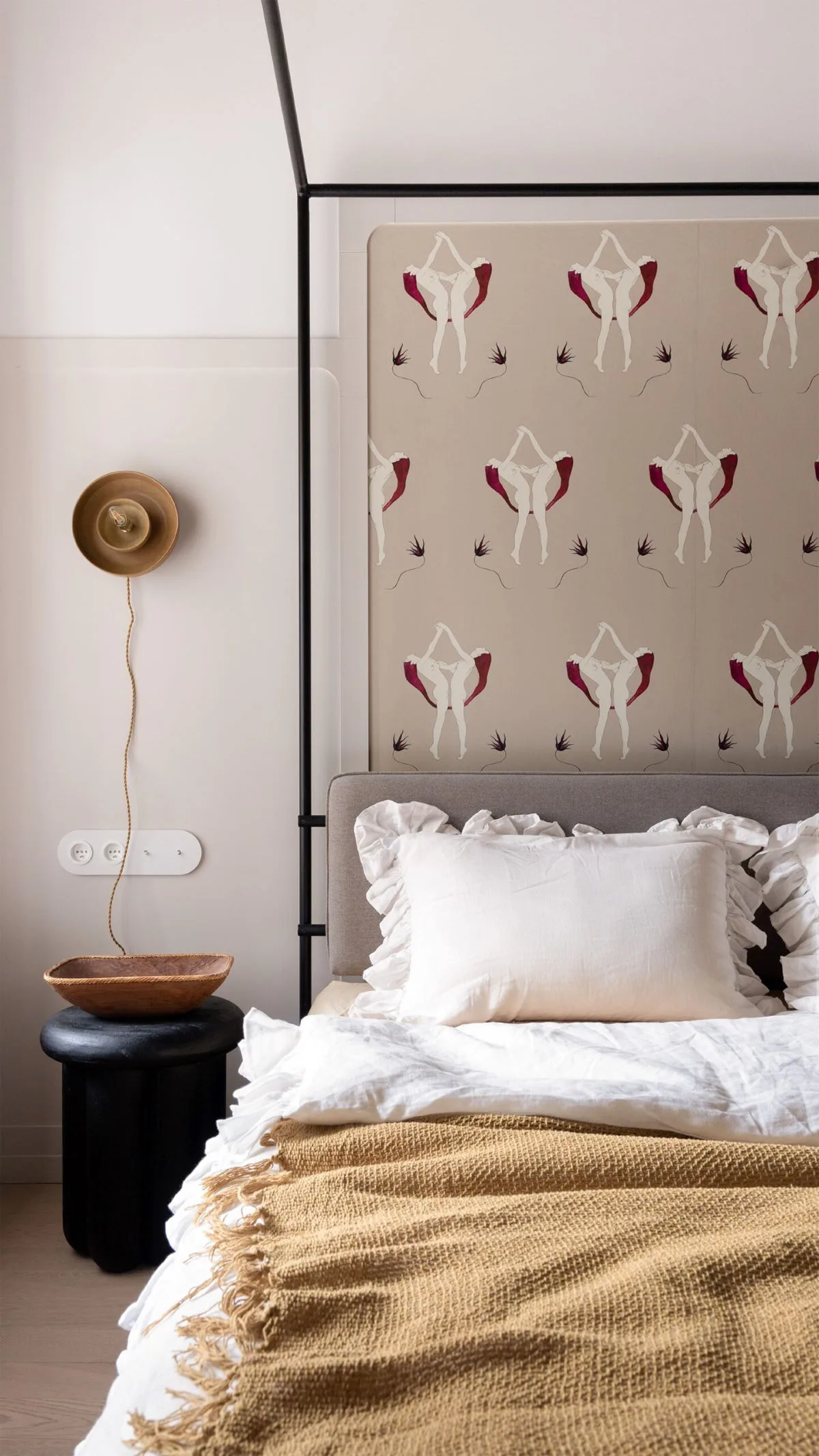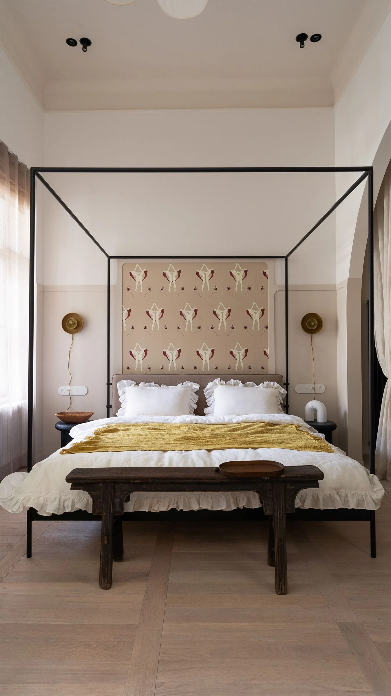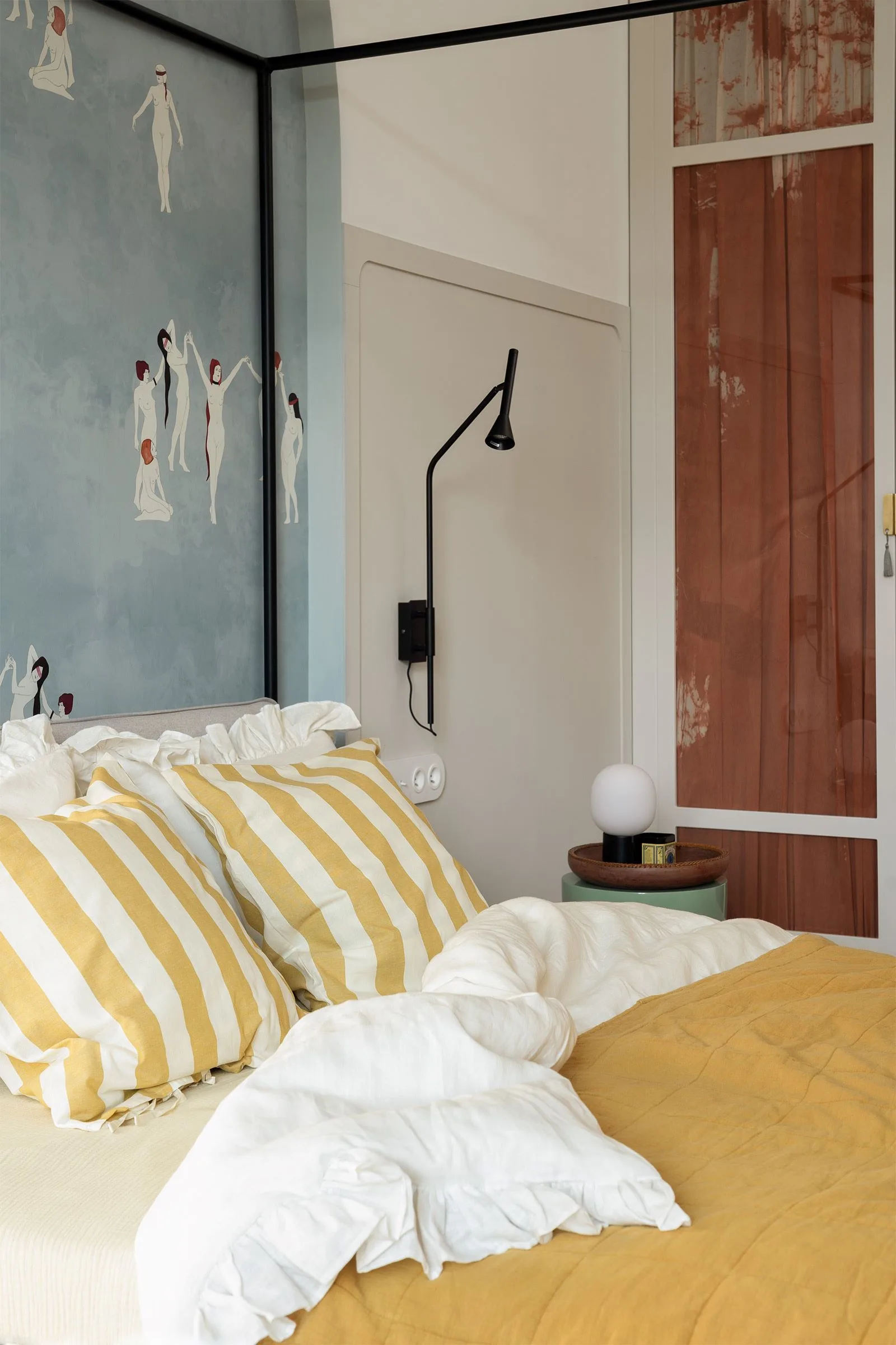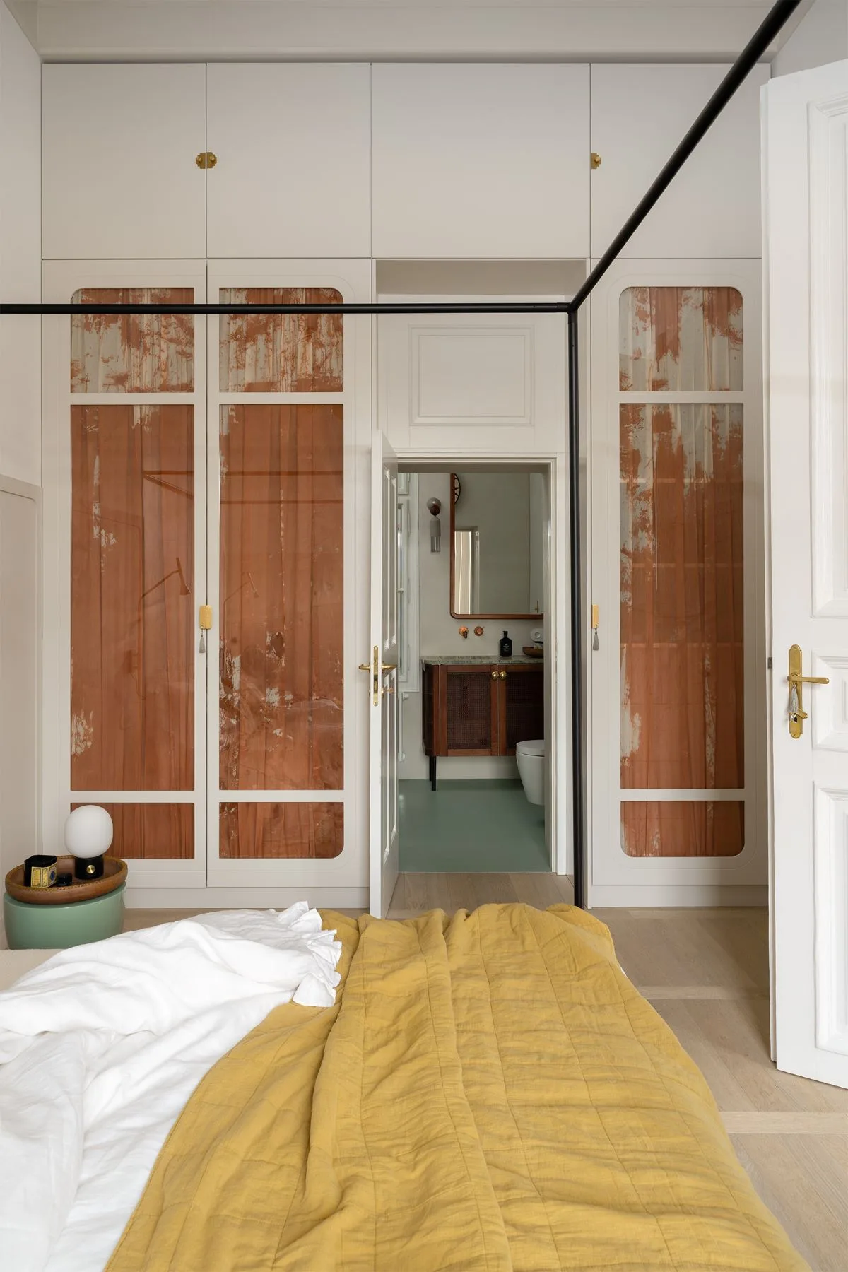 W jednej z sypialni zamiast tradycyjnych drzwi w szafie zastosowano zasłony wykonane na zamówienie w Paryżu, co nadało wnętrzu francuskiego uroku i unikalności.