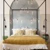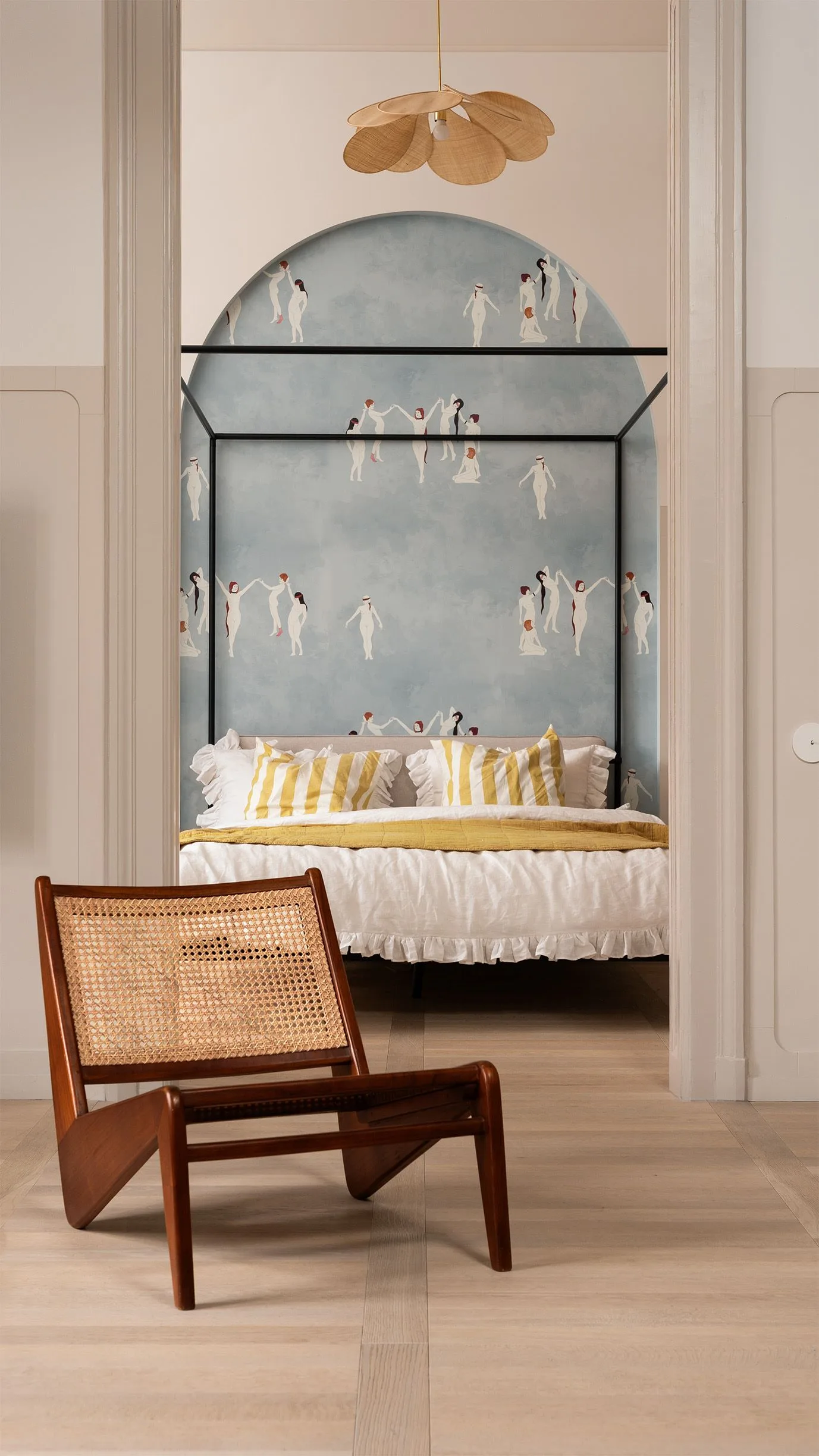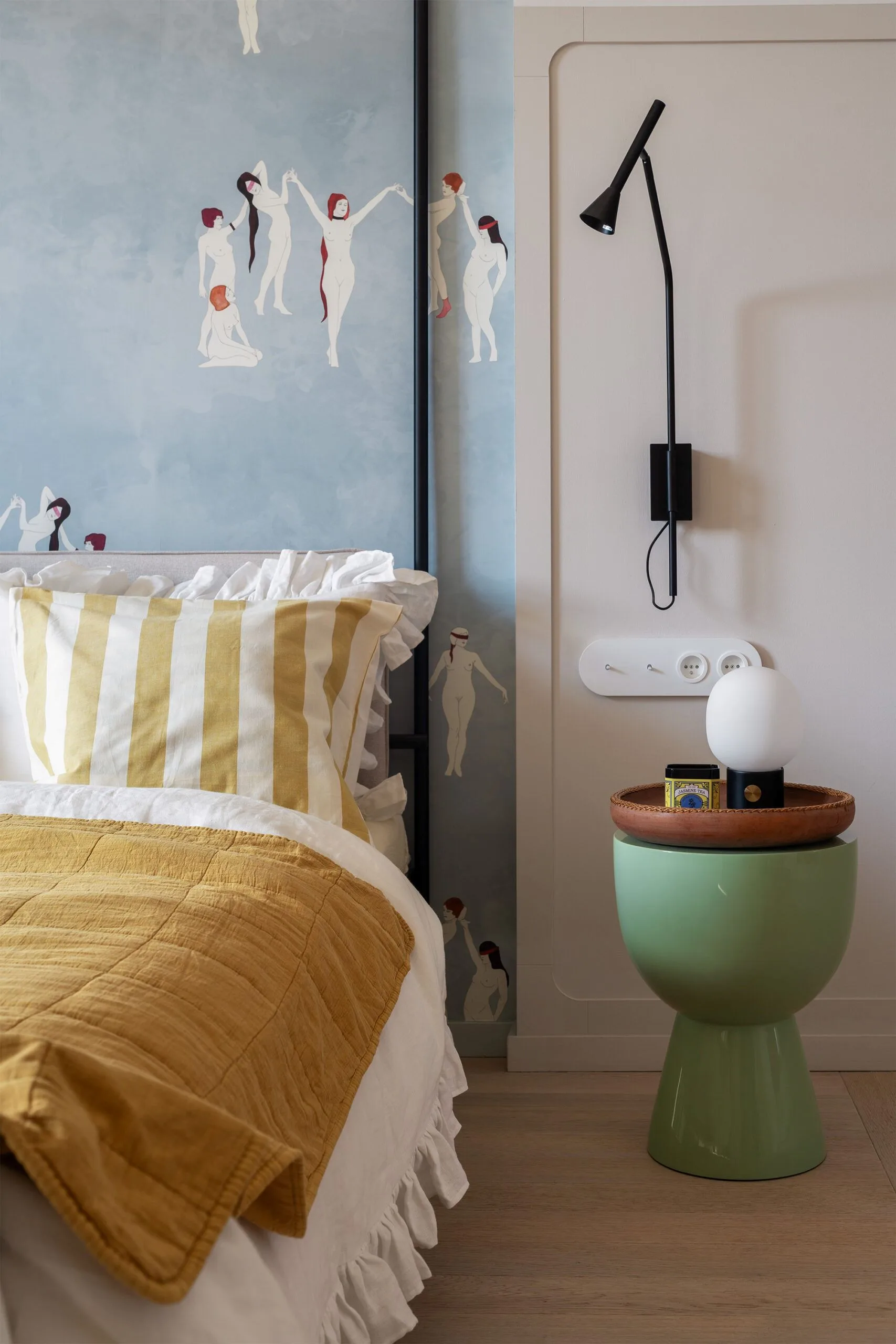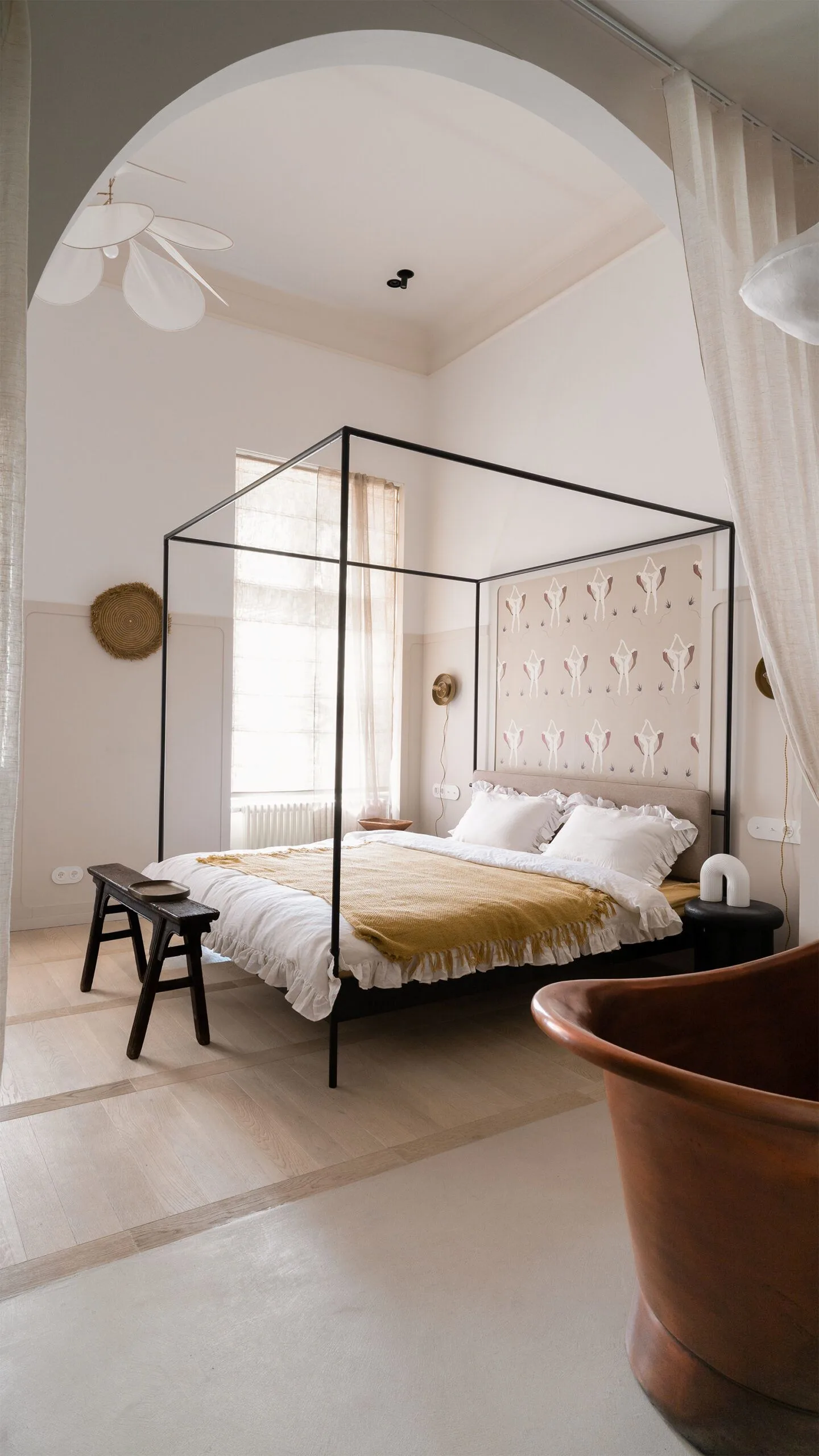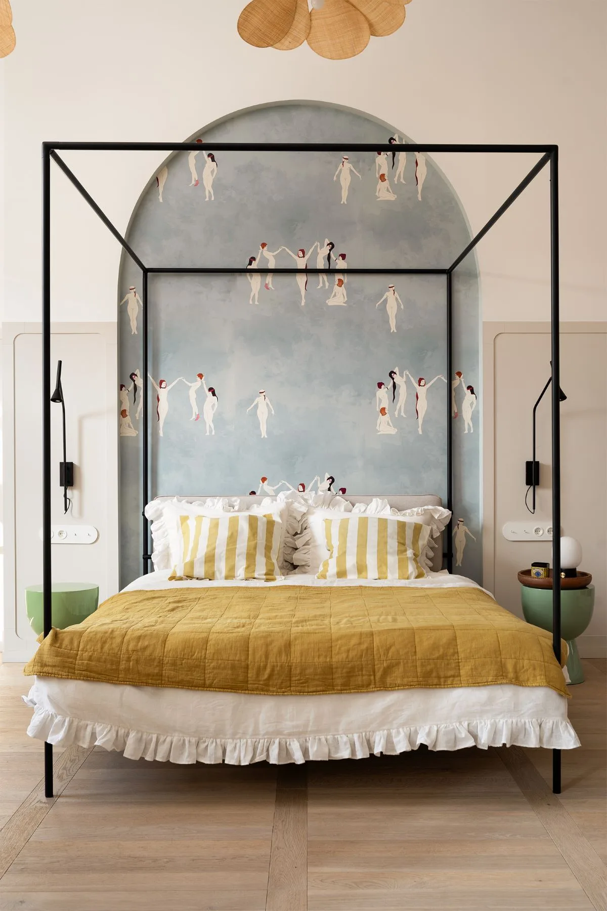 W jednej z sypialni zamiast tradycyjnych drzwi w szafie zastosowano zasłony wykonane na zamówienie w Paryżu, co nadało wnętrzu francuskiego uroku i unikalności.