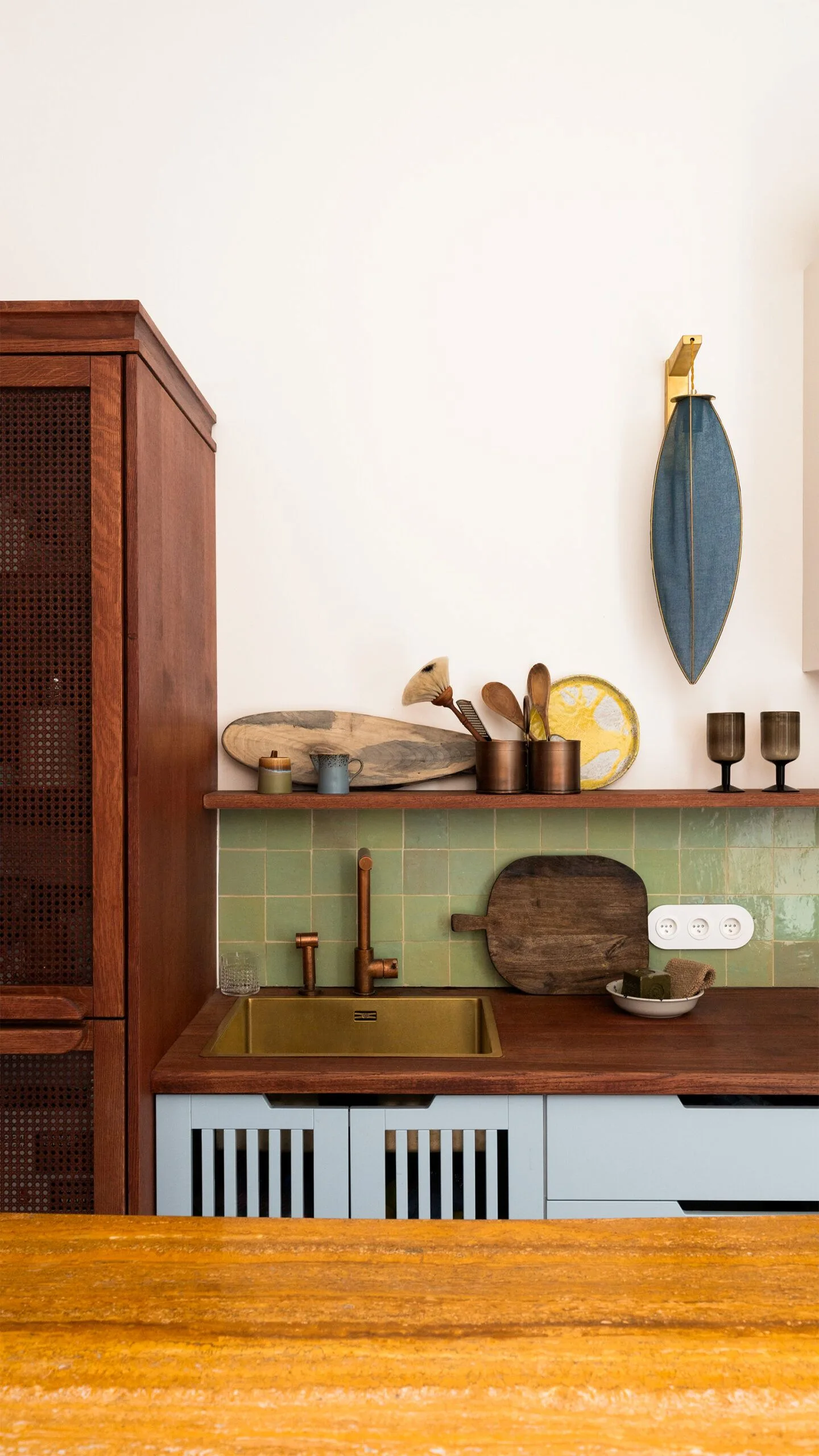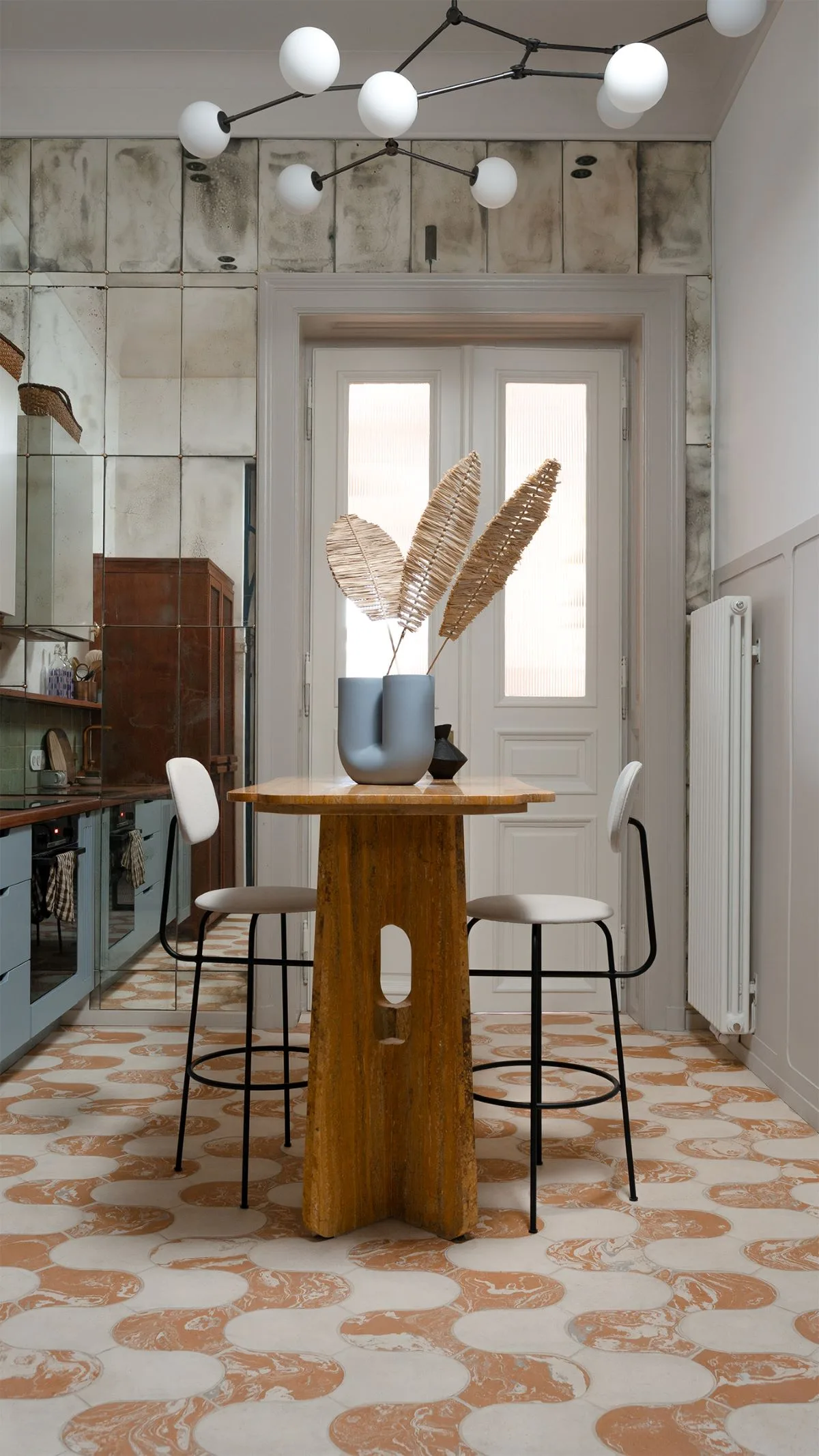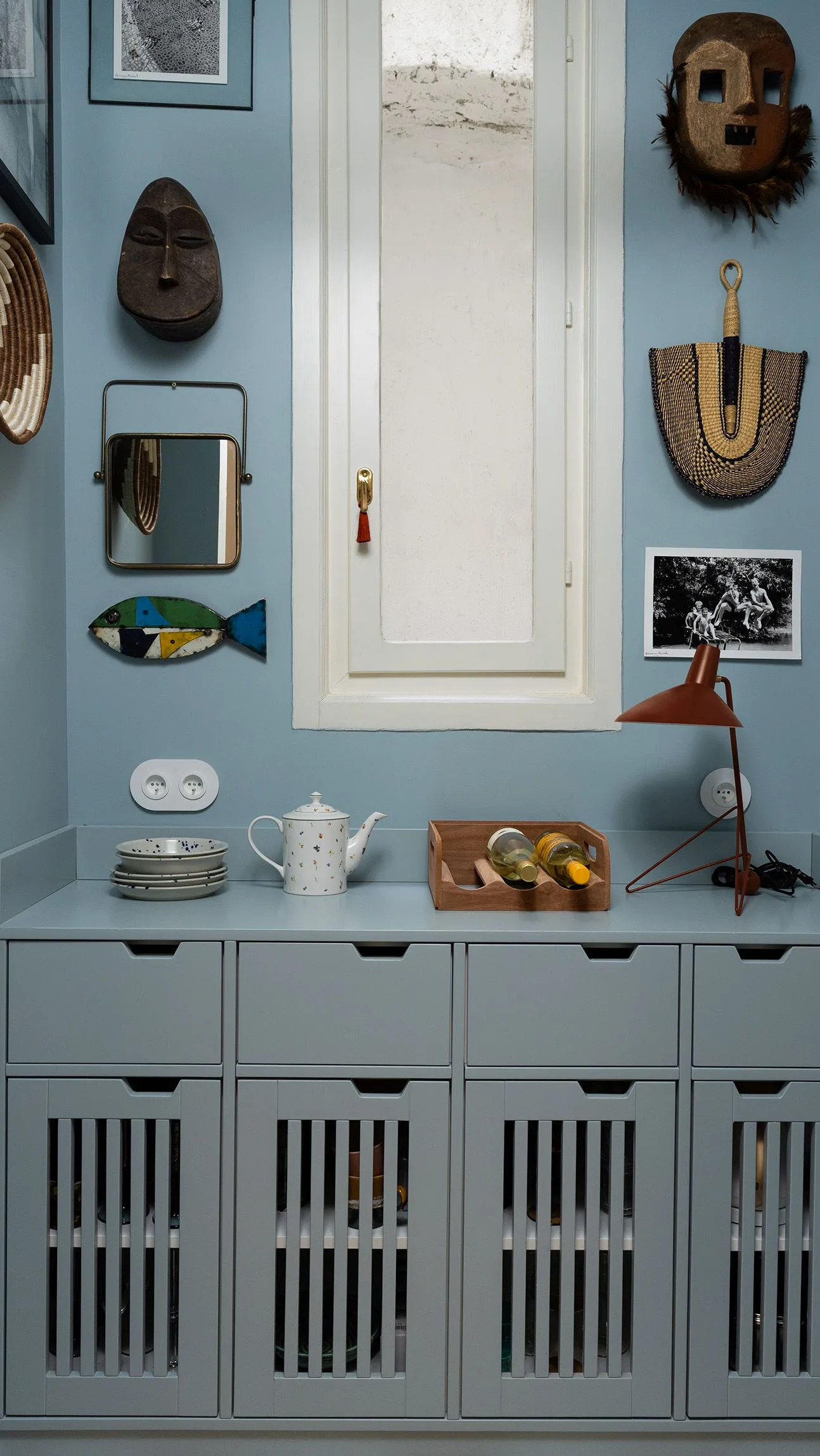 Aby optycznie powiększyć przestrzeń, umieszczono na jednej ze ścian lustro w stylu retro, a dodatkowo zorganizowali mini galerię sztuki z afrykańskimi artefaktami oraz stojak na napoje, co nadało osobisty charakter i praktyczność kuchni.