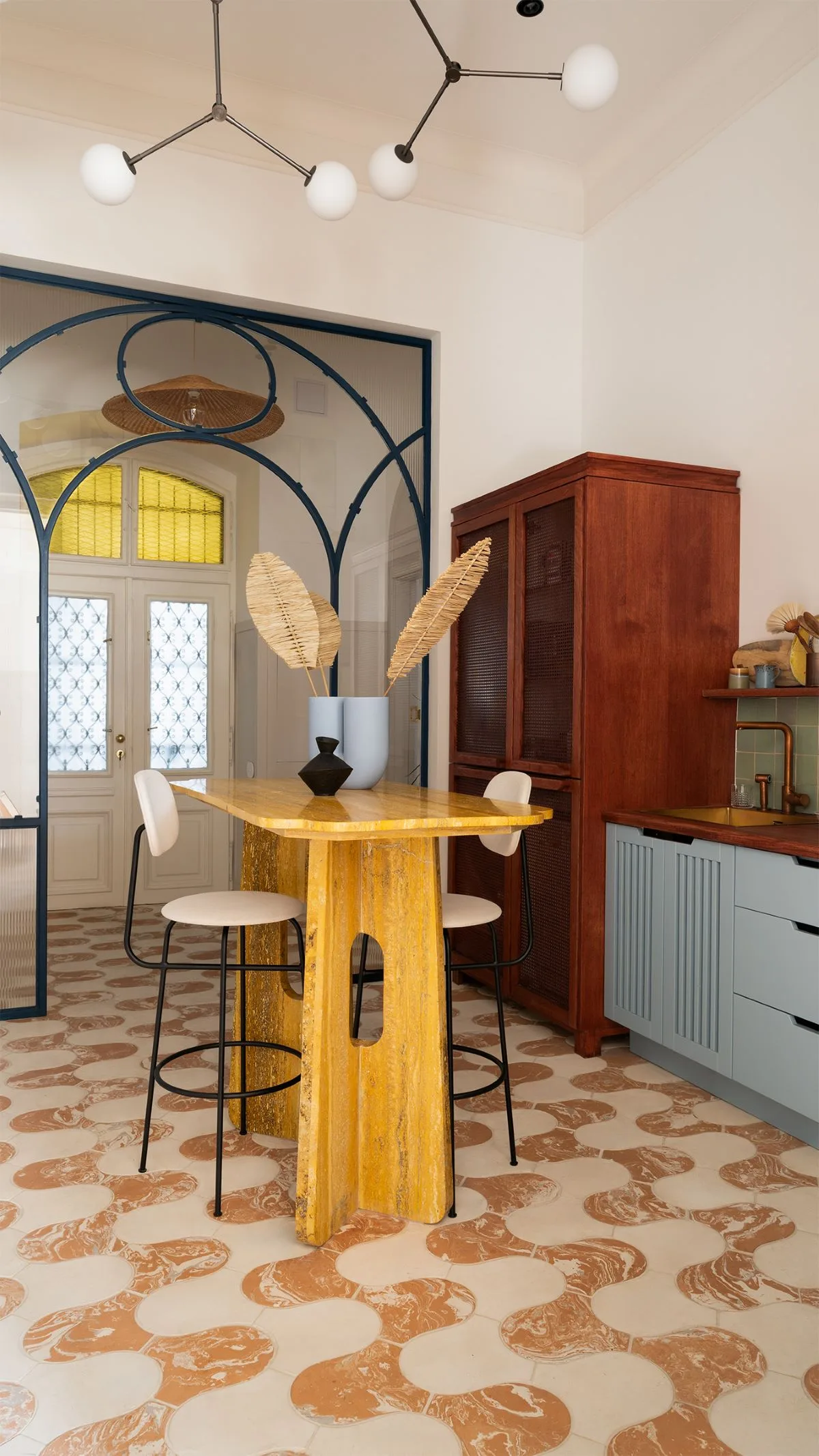 Przemieniono długi, wąski korytarz w pełni funkcjonalną kuchnię. Pomimo ograniczonego dostępu do naturalnego światła, zastosowanie bogatych faktur, subtelnych kolorów i gry światłem sprawiło, że ta przestrzeń nabrała wyjątkowego charakteru. Centralnym punktem kuchni stała się wyspa wykonana z żółtego trawertynu, zaprojektowana specjalnie na potrzeby tego wnętrza przez Katarinę Rulinską. Wyspa zyskała zaokrąglone kształty, łącząc funkcjonalność z przytulnością.