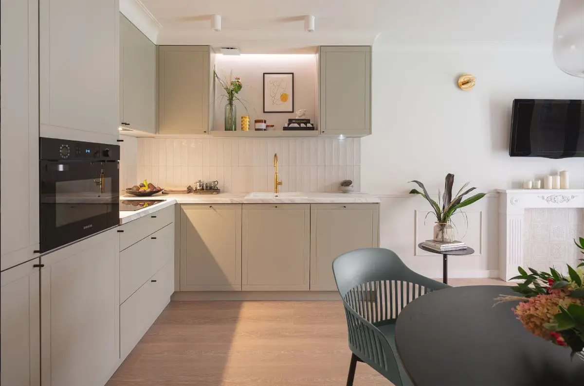 W opozycji do matowych szafek stoją płytki w stylu zellige tworzące ciekawą fakturę na ścianie nad blatem. Sposób w jaki odbijają światło udowadnia, że piękna możemy doszukiwać się nawet w pozornej niedoskonałości. Takie kontrolowane odejścia od utartych kanonów przyczyniają się do powstawania ciekawych dla oczu miejsc. Mini galeria służąca do ekspozycji ładnych rzeczy oraz złota bateria uatrakcyjniają kuchenną przestrzeń.