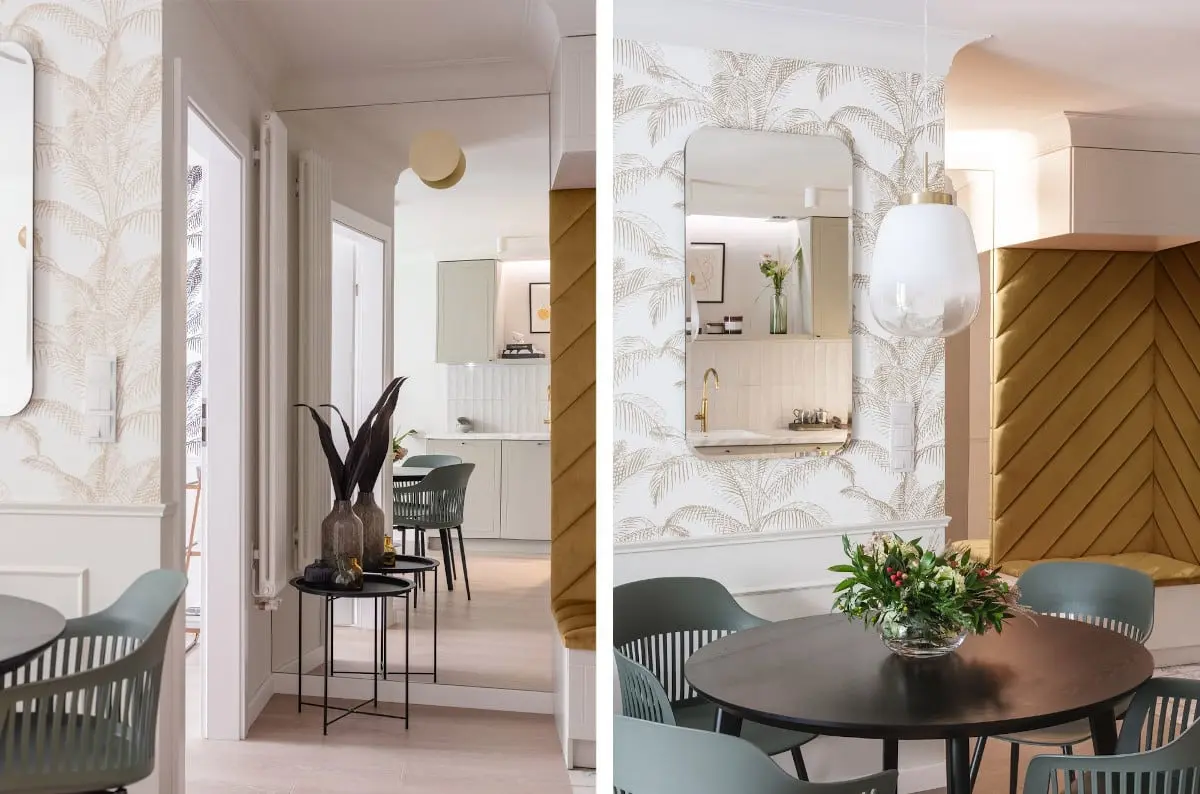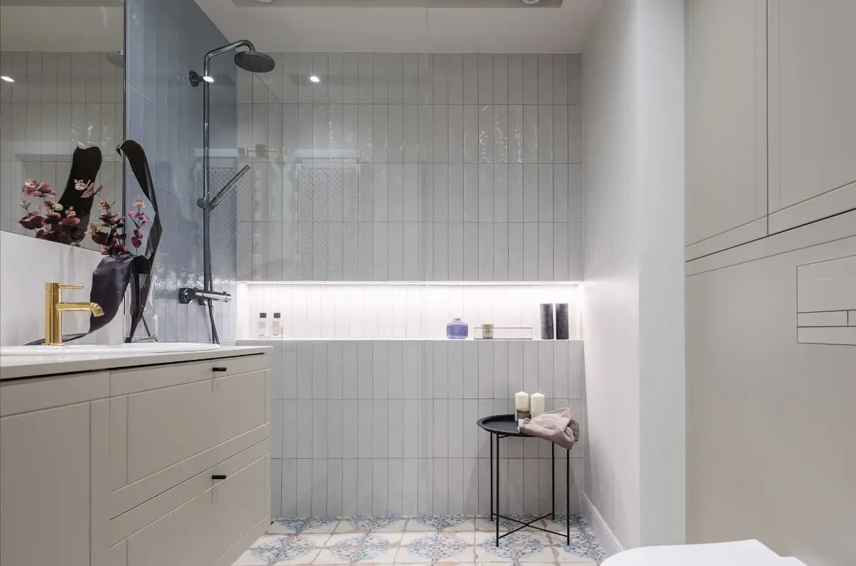 Łazienka również pozostaje w łączności z innymi pomieszczeniami. Pionowo ułożone płytki zellige na zmianę z matowymi frontami kryjącymi potrzebne do przechowywania półki, tworzą aranżację ścian. Dla odmiany, na podłodze znalazły się postarzane płytki w stylu azulejos, które stanowią ukłon w stronę historii projektowania. Duża ilość luster obecnych w całym mieszkaniu, w tym także w łazience, wpływa na lepszy odbiór wnętrza, które pomimo nie za dużego metrażu, wygląda na przestronne.