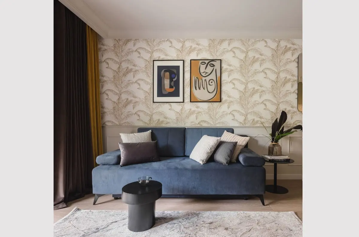 W salonie, za sprawą tropikalnej tapety, możemy poczuć klimat wiecznych wakacji. Na jej tle stoi kompaktowa sofa. Jednakże w tym salonie nic nie jest takie oczywiste, jakie może się wydawać. Wystarczy zrobić parę kroków, aby stanąć przy iście klasycystycznym elemencie wystroju wnętrza. Atrapa kominka, udekorowana wewnątrz kafelkami jest idealną przeciwwagą dla tapety w klimacie boho. Łącznikiem jest postarzany dywan.