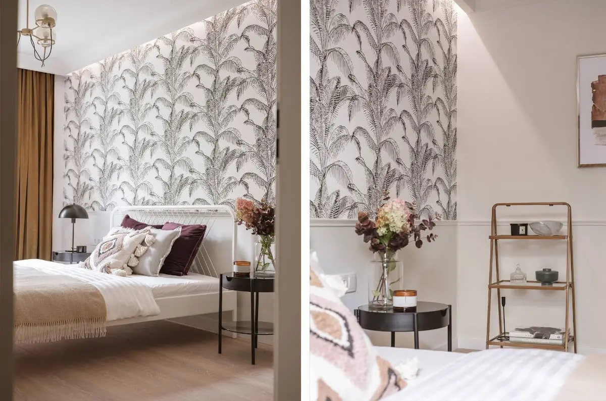 Sypialnia także urzeka lekkością. Nie bez znaczenia dla uzyskania takiego efektu jest łóżko z ażurowym wezgłowiem i bardzo delikatnym w formie stelażu. Ścianę za łóżkiem zdobi ta sama tapeta, która jest w salonie. Różni ją jedynie gama kolorystyczna. Sielski klimat potęgują poduchy w boho stylu. Całość architektka podrasowała musztardowymi zasłonami oraz złotymi akcentami.