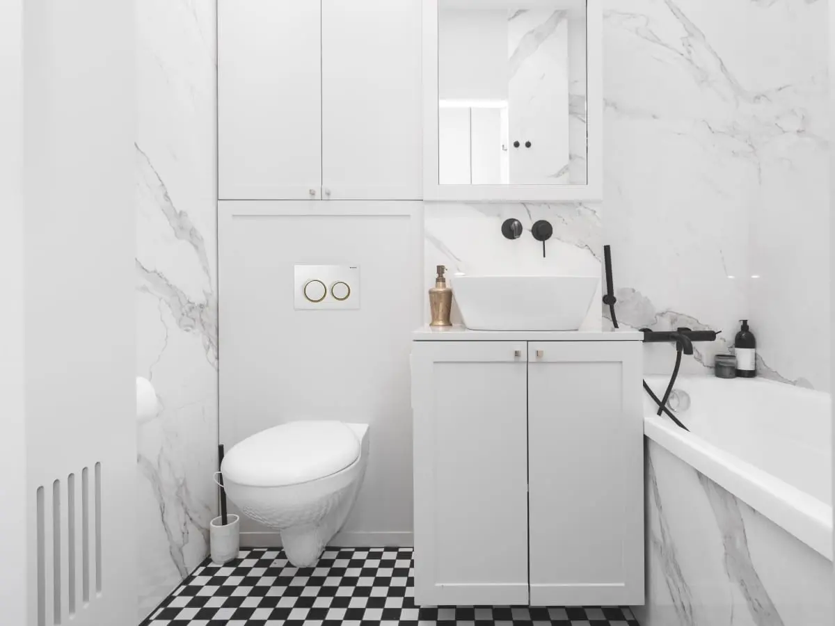 Kontrapunktem wobec kolorowej i pełnej kontrastów aranżacji jest łazienka. Tutaj zdecydowano się na bardzo klasyczną i minimalistyczną aranżację, która ułatwia wyciszenie się i relaks. Bazą są spieki kwarcowe o teksturze marmuru z bardzo subtelną żyłą. Pokrywają ściany oraz zabudowę wanny. Na podłogę wybrano czarno-białą szachownicę. Uzupełnieniem wnętrza jest czarna armatura oraz złote dodatki.
