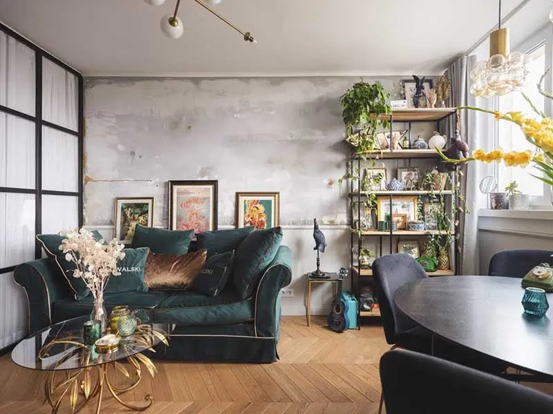 Wyjątkowe wnętrze w stylu eklektycznym powstało dla młodego muzyka. Natomiast metamorfozę mieszkania zainicjowała przyjaciółka właściciela, która chciała mu zrobić niespodziankę. Wraz z Barbarą Godawską z pracowni iHome Studio, stworzyły oryginalną przestrzeń sprzyjającą twórczej pracy, a w dodatku skrojoną na miarę gospodarza. Motywem przewodnim jest tu butelkowa zieleń, której towarzyszą nietuzinkowe bibeloty oraz liczne grafiki i obrazki w ozdobnych ramach. Architektka zadbała również o rozwiązania funkcjonalne tak, by mieszkanie mieściło wszystko co niezbędne do wygodnego życia. Na niewielkim metrażu piętrzą się przeróżne tekstury i style, które pozornie do siebie nie pasują, ale składają się w spójną całość i opowiadają historię mieszkającego tu artysty.
