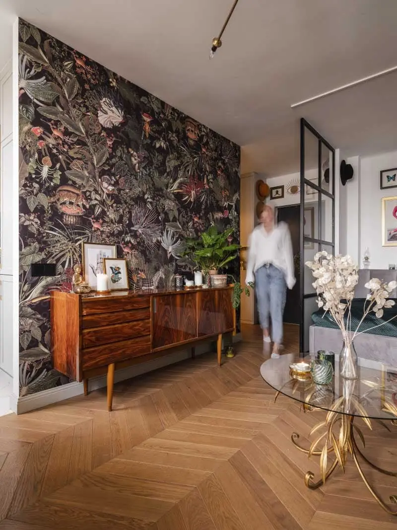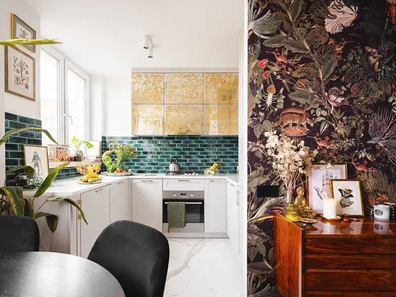 Mieszkanie zlokalizowane na warszawskim Mokotowie posiada powierzchnię 30m2. Składa się z niewielkiego przedsionka, pokoju z aneksem kuchennym oraz łazienki. Założeniem projektu było poprawienie funkcjonalności niewielkiej przestrzeni. Zespołowi z iHome Studio udało się to, dzięki wydzieleniu stref funkcjonalnych oraz zwiększeniu do maksimum szaf z miejscem do przechowywania, co poskutkowało zdecydowanym podwyższeniem standardu mieszkania. Punktem wyjścia dla koncepcji wnętrza stał się styl eklektyczny oraz śmiałe połączenia kolorystyczne i materiałowe, oddające gust gospodarza. Natomiast jedną z głównych inspiracji były ciemnozielone, szkliwione płytki w typie cegiełki, które finalnie znalazły się nad blatem kuchennym. Ich butelkowy odcień stał się lejtmotywem barwnym aranżacji. Znajdziemy go na ściance pokrytej oryginalną tapetą Arte Moooi oraz kanapie, stanowiącej centrum części dziennej. Kontrasty powierzchni również grają tu dominującą rolę. Górne szafki kuchenne, zostały wykonane z lustra starzonego, wytrawianego ręcznie aby uzyskać pożądany efekt. Ściana za sofą w duchu wabi-sabi, imituje powierzchnię surowego betonu, a podłogę pokrywa klasyczna jodełka. Nie zabrakło również motywu vintage w postaci lakierowanej komody z przełomu lat 60 i 70. Natomiast w dodatkach i dekoracjach dominuje złoto.