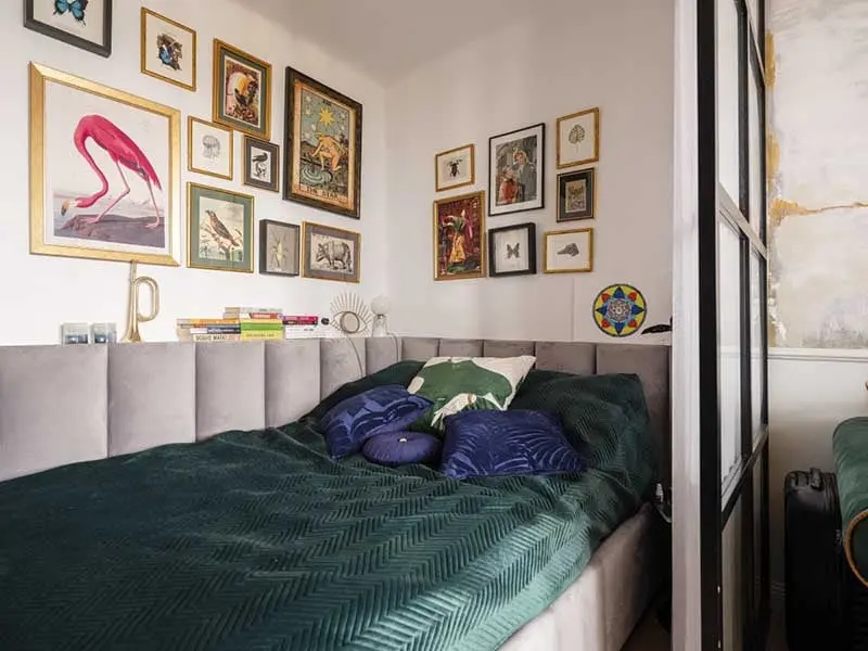 Bardzo ciekawym pomysłem na wyodrębnienie z małej kawalerki strefy nocnej, było stworzenie lekkiego przepierzenia. Właśnie za sprawą ścianek z lakierowanego drewna i szkła, powstała mini sypialnia, którą w razie potrzeby można całkowicie „zamknąć” firanami. Przestrzeń wypełnia łóżko z tapicerowanym panelem. Jest on na tyle szeroki, by pełnił dodatkowo funkcję półki na książki i ulubione przedmioty właściciela. Nad łóżkiem znalazła się oryginalna galeria ścienna z ciekawymi grafikami, idealnie wpisująca się w eklektyczny charakter aranżacji.