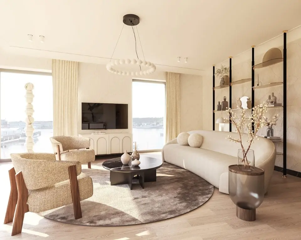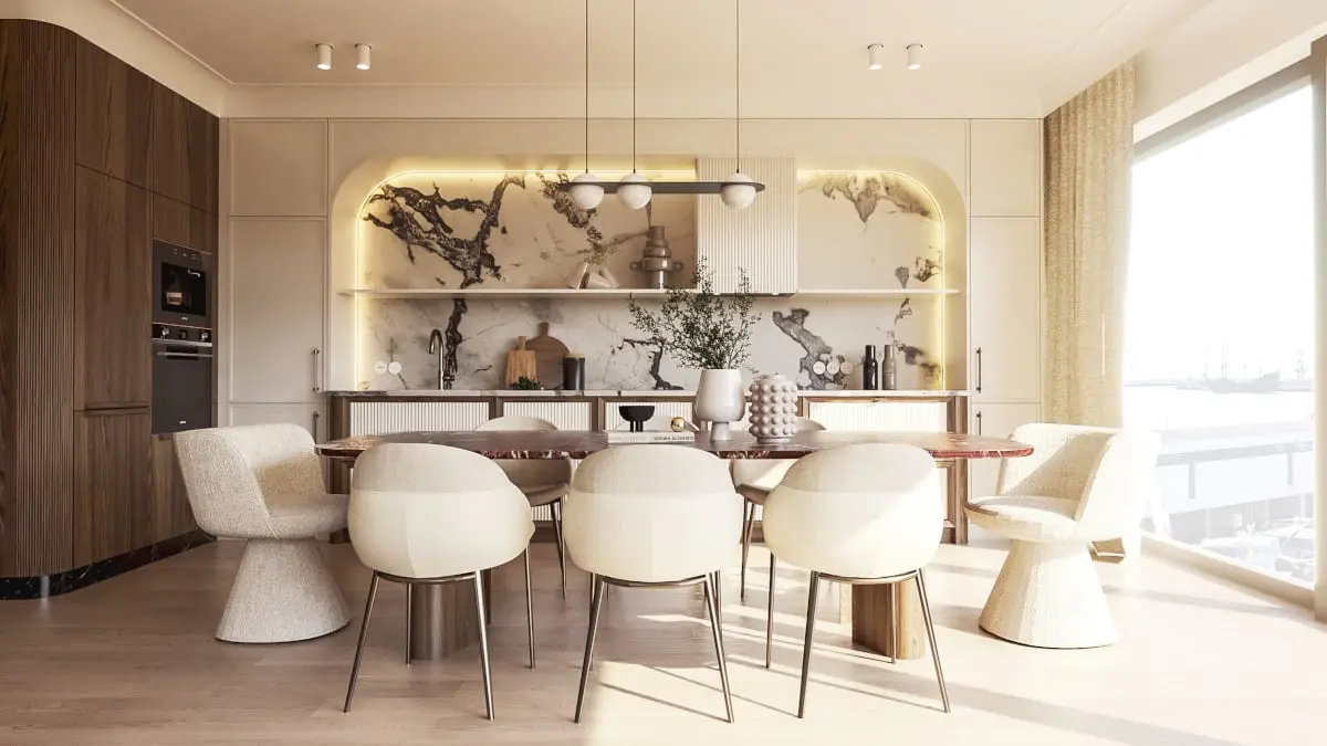 Część dzienna jest zaprojektowana w oparciu o jasne kolory oscylujące wokół modnego beżu, który pozwala w pełni wybrzmieć pięknemu krajobrazowi zza okien. ,,Miękkości” wnętrzu nadają meble o opływowych kształtach. Ich design nie tylko idealnie wpisuje się w aktualne trendy, ale też przełamuje dynamiczny kształt pomieszczenia. Dodatkowe walory estetyczne dostarczają różnorodne materiały, razem tworzące bardzo spójny obraz.