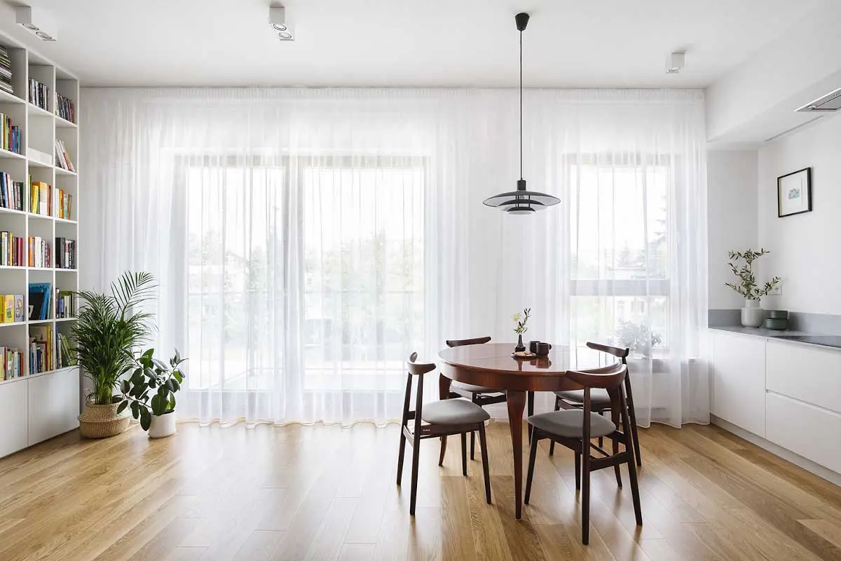 Elementem symbolicznie oddzielającym strefę kuchenną od salonu, jest stół w otoczeniu krzeseł. Dzięki temu, że architekci wybrali okrągły mebel, nie przytłacza wnętrza. Taki kształt jest również bardziej ustawny, co w przypadku otwartego wnętrza jest dużym plusem. Forma w stylu vintage a także wysokopołyskowy blat nieśmiało zapowiada eklektyczną orientację projektu.