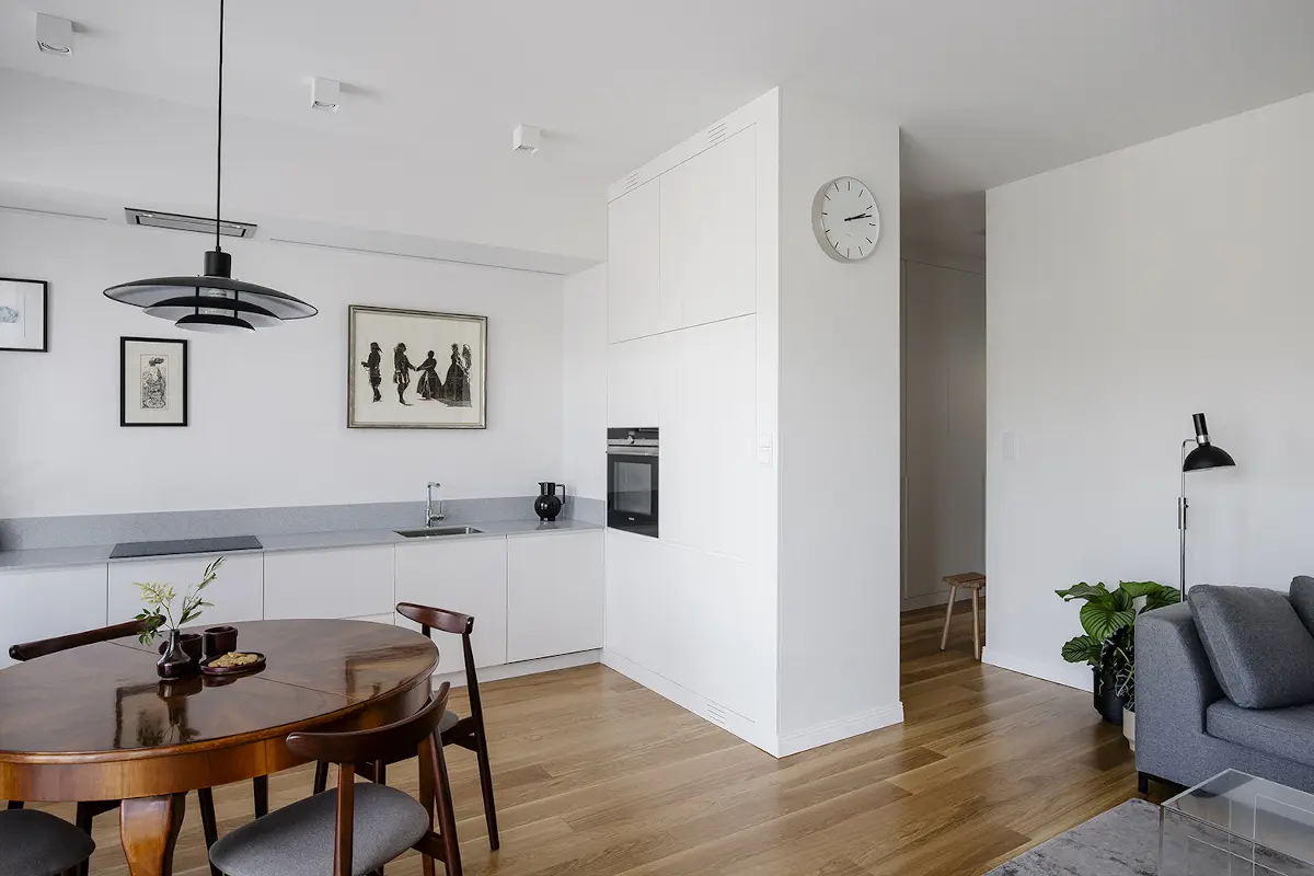 Wspólną, otwartą przestrzeń tworzy aneks kuchenny, mała jadalnia i salon. Dzięki przemyślanemu układowi mieszkania, naturalne światło ma szansę dotrzeć również do przedpokoju. Tym samym lokum jest jaśniejsze i bardziej przestronne. Tłem dla jadalni i salonu jest minimalistyczna biała kuchnia w kształcie litery L. Takie projekty jak ten udowadniają, że taki układ najlepiej sprawdza się przy mniejszym metrażu.
