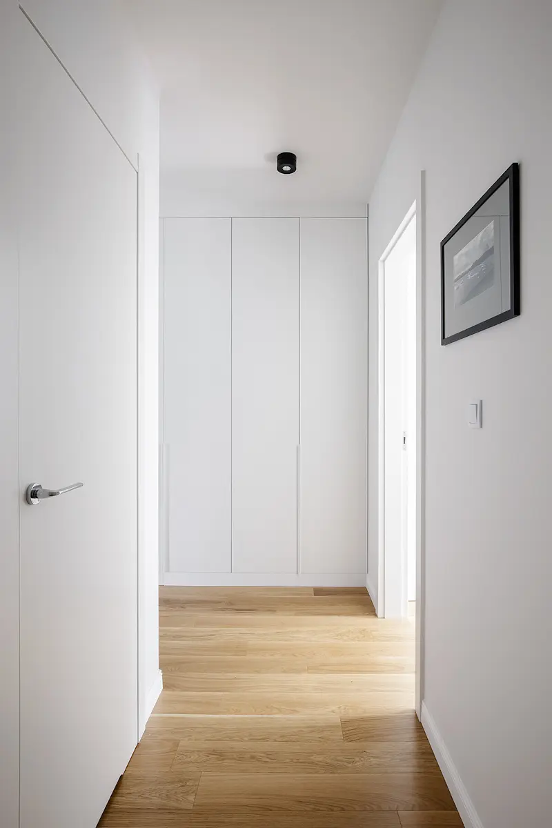 Miejsce do przechowywania architekci wygospodarowali w holu, gdzie znajduje się minimalistyczna zabudowa pełniąca rolę ściany.