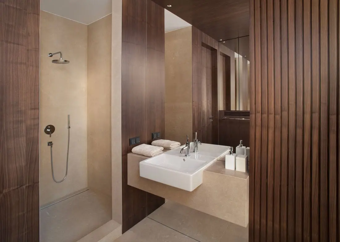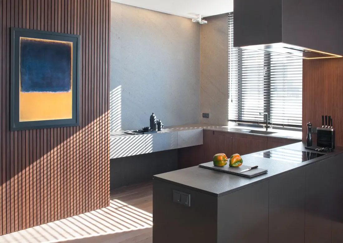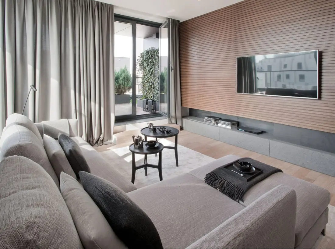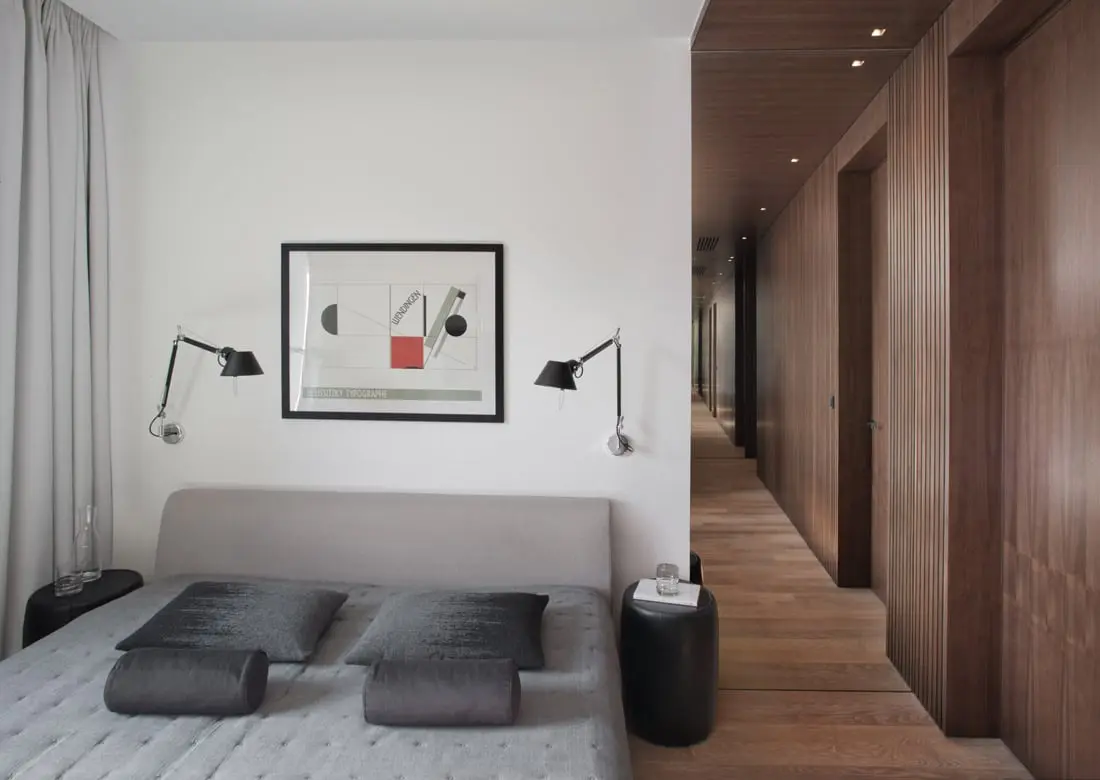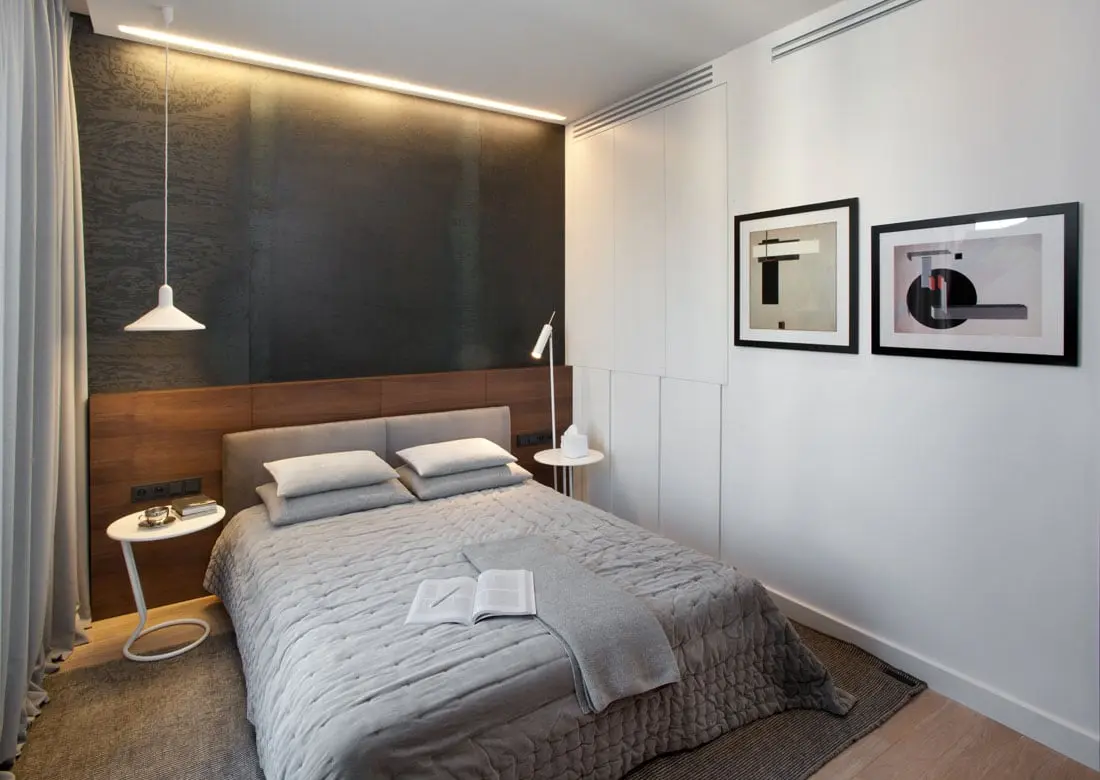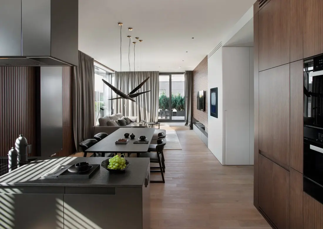 Nowoczesna aranżacja wnętrza charakteryzująca się zamiłowaniem do prostych linii została przełamana wykorzystaniem ciepłych barw i drewna. Pomimo, że mieszkanie nie ma ogromnego metrażu, to sprawia wrażenie jakby takie było. Taki efekt udało się osiągnąć dzięki wyzbyciu się wszystkich zbędnych działowych ścian.
