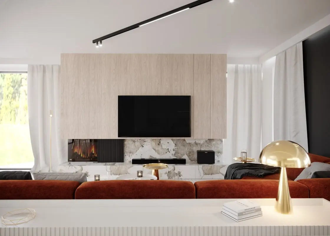 Choć w zaprezentowanym wnętrzu dominują stonowane barwy i naturalne materiały, to mocne plamy koloru w postaci wyrazistego bordo nadają ton całej aranżacji. Kolor z pogranicza czerwieni i czerni nie jest wykorzystany jedynie w formie detali. Wręcz przeciwnie – pojawia się na dużych elementach, takich jak łóżko w sypialni, narożnik w salonie, czy całe okleiny ścian w salonie kąpielowym. Ten barwny leitmotiv staje się swoistym drogowskazem, wyznaczając estetykę projektu. Jest tu nie tylko pięknie, ale też bardzo charyzmatycznie i odważnie. Zestawienie bordo z marmurem, złotem i drewnem definiuje elegancki charakter miejsca. Za projekt odpowiada arch. Dorota Pilor – Jakulwicz (Foorma Pracownia Architektury Wnętrz).